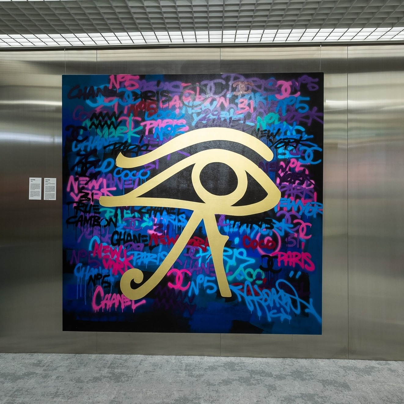 “Horus Eye”, tác phẩm trong bộ ba khổ lớn trong BST kết hợp với Karl Lagerfeld, tôn vinh nền văn hóa của Pharaoh với bề dày lịch sử hơn 4000 năm, đồng thời tôn vinh những giá trị nghệ thuật vượt thời gian mà Karl Lagerfeld đã để lại cho người mến mộ