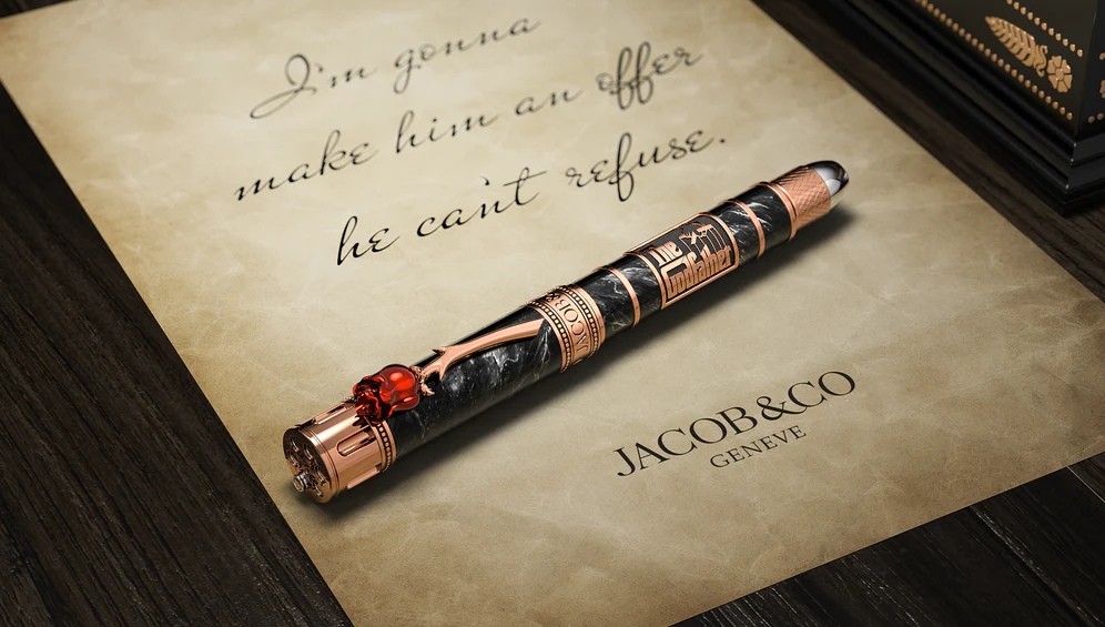Từng nét chữ nắn nót tuôn trào nơi ngòi bút The Godfather Pen gói gọn bao cảm xúc chân thành, khiến ai đó không thể chối từ. Tương tự bộ sưu tập đồng hồ Opera Godfather, những chiếc bút kí Jacob & Co. sang trọng thành hình nhờ nguồn cảm hứng dạt dào đến từ bộ phim kinh điển, “Bố Già”.