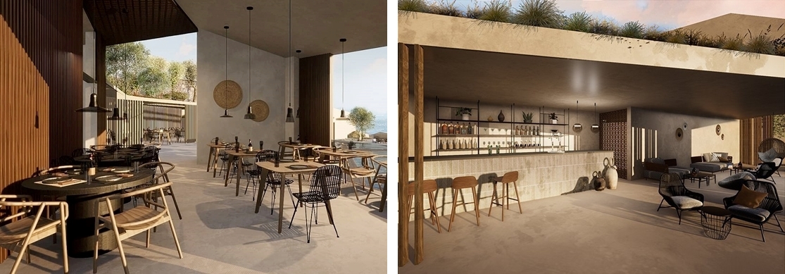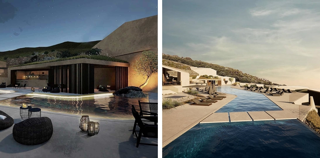 Vì các ngôi làng Hy Lạp neo đậu trên sườn núi và có quảng trường công cộng nằm ở trung tâm, Ampia Vista Retreat được triển khai trên loạt các cấp độ khác nhau, trong khi các không gian cộng đồng, như khu vực hồ bơi lớn, khu vực nhà hàng và bar nằm trong trung tâm.