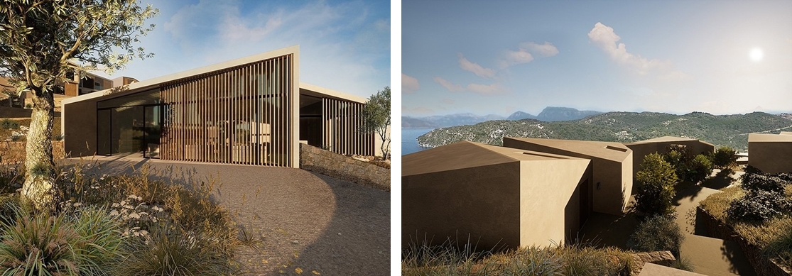 Phương pháp xây dựng lấy tham chiếu từ mái dốc kép và mái hông điển hình của những ngôi nhà trên đảo Ionian. Phần cứng ngoại thất gồm tường và mái nhà được ốp bằng tông màu đất và vật liệu tự nhiên, trông giống như một tác phẩm điêu khắc hình lăng trụ.