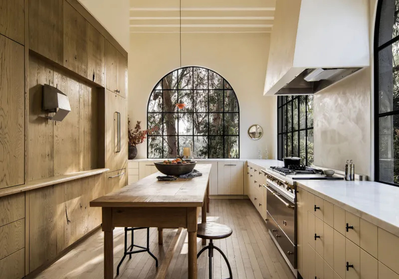 Trung tâm của ngôi nhà là phòng khách cao hai tầng, nơi ánh sáng xuyên qua cửa sổ vòm khổng lồ, kết hợp cùng lò sưởi tối giản và tường đất sét tạo nên một khung cảnh vừa hùng vĩ vừa an yên. Nhà bếp liền kề, với đảo bếp gỗ sồi nguyên khối và bếp Lacanche cao cấp, kết nối hài hòa với phòng sinh hoạt mở ra khu sân sau thoáng đãng.