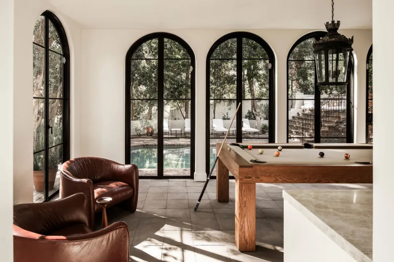 Khu vực bi-da ở tầng dưới nhìn ra hồ bơi.
