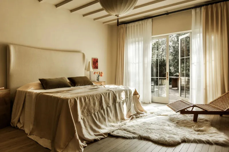 Chất liệu là linh hồn của ngôi nhà: sàn gỗ sồi Pháp bản lớn, tường phủ đất sét Roman và sơn limewash, gạch gốm thủ công từ Tây Ban Nha mang lại chiều sâu và sự ấm áp. Các khung cửa sổ thép hình vòm và cửa gấp mở rộng ánh sáng tối ưu, nhờ vào nghiên cứu hướng nắng cẩn thận. Phòng tắm được hoàn thiện bằng tadelakt, loại vữa truyền thống của Morocco vừa mang tính thẩm mỹ, vừa bền bỉ với thời gian.