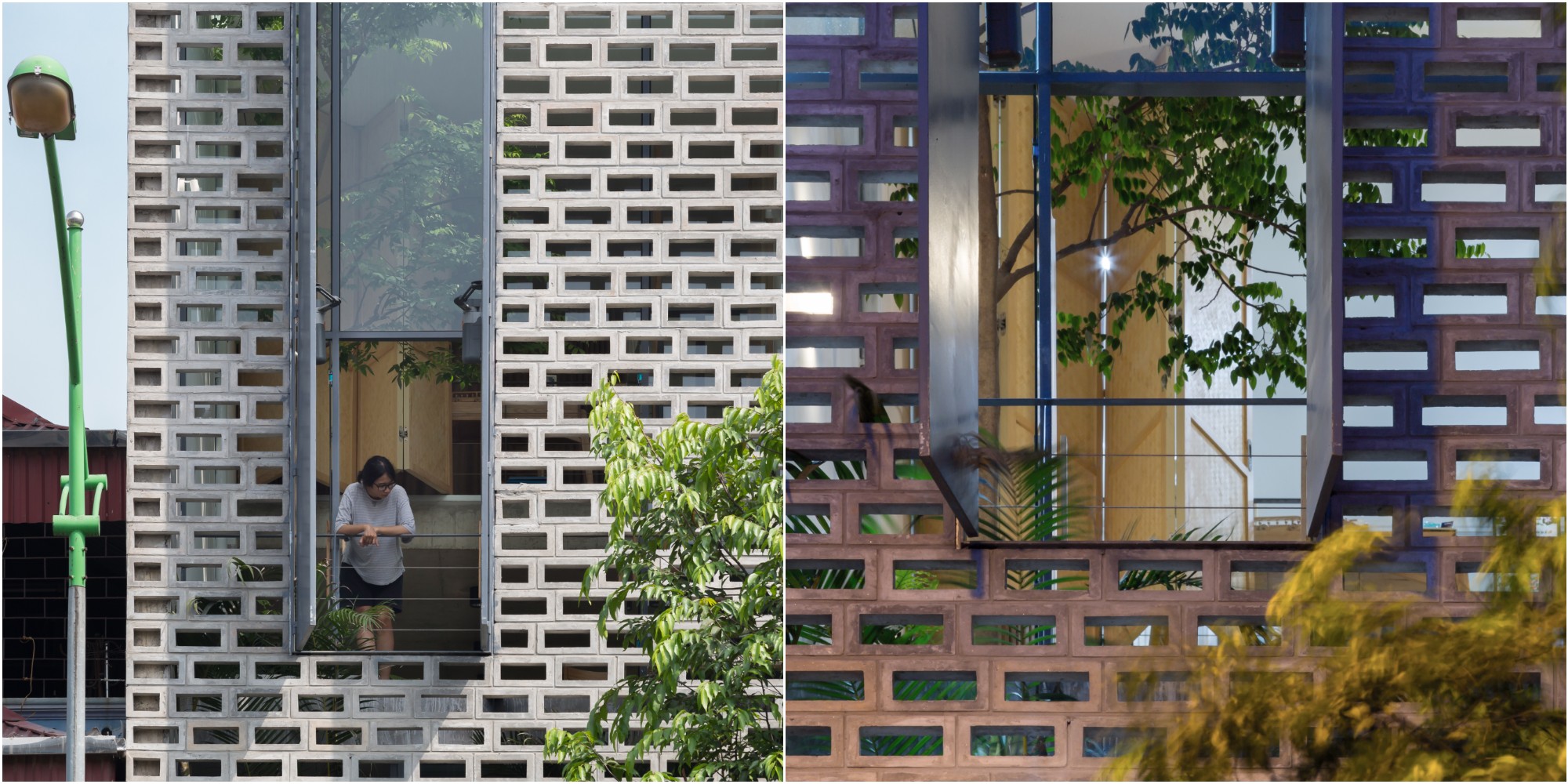 Mặt tiền của CH House sở hữu hai lớp, với lớp ngoài làm từ các khối xi măng và gạch được sắp xếp để tạo lỗ trống. Lớp trong thì được lắp kính khung thép vô cùng an toàn. Thiết kế ấn tượng này giúp cho ngôi nhà có khả năng chắn bụi bẩn, che nắng và đồng thời tận hưởng được không khí tự nhiên ở khắp mọi nơi.