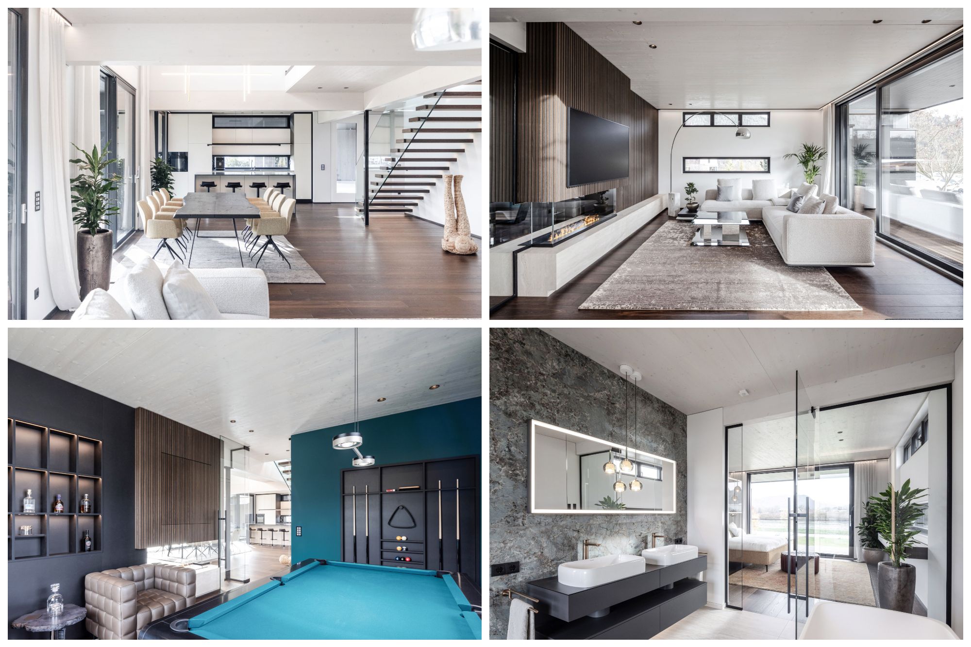 Chỉ những vật liệu xác thực và bền vững sở hữu chất lượng cao nhất, chẳng hạn như gỗ và thủy tinh, mới được sử dụng. Floating House còn nổi bật bởi nội thất cao cấp, mang thương hiệu Duravit (dòng phòng tắm Qatego), LIGHT-POINT (bộ sưu tập đèn ILAY và BLADE), HAFI (tay nắm cửa Thiết kế Cao cấp), bàn bida 247 huyền thoại đến salon riêng biệt dành riêng.