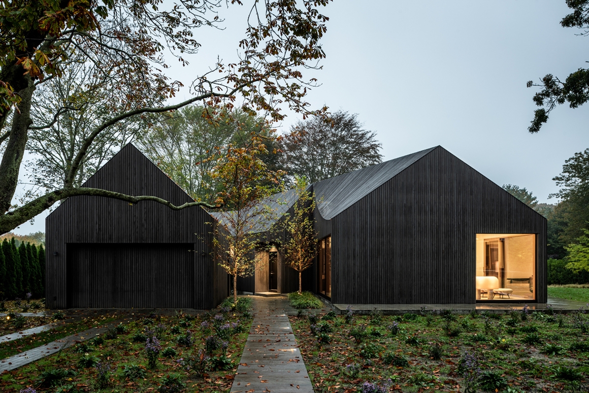Mỗi một mô-đun đều có đầu hồi được sắp xếp và căn chỉnh đường gờ mái để tạo nên sự kết nối với nhau. Nhờ thiết kế đường cong như dòng nước chảy, mái hiên của các mô-đun đem tới hiệu ứng nhấp nhô nhưng vẫn liên kết rất hợp lý. Khác với bên ngoài, các khu vực trong nhà như sân vườn hình tam giác và hiên nhà đều được bao phủ bởi gỗ tuyết tùng màu vàng.