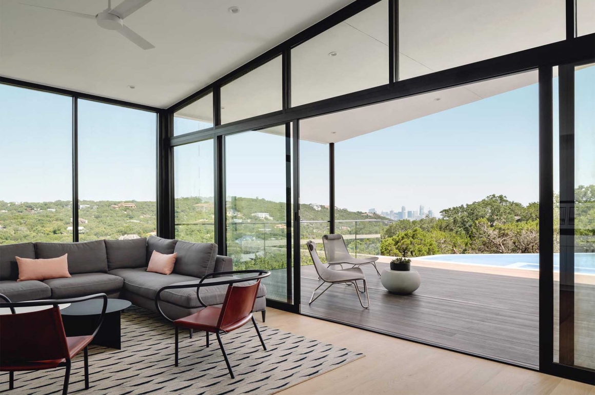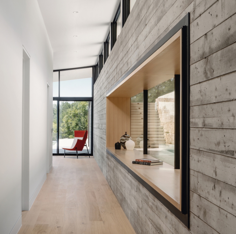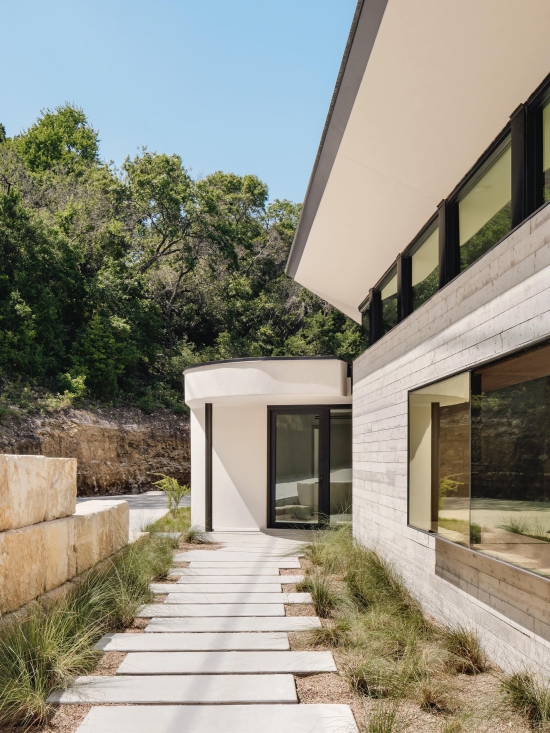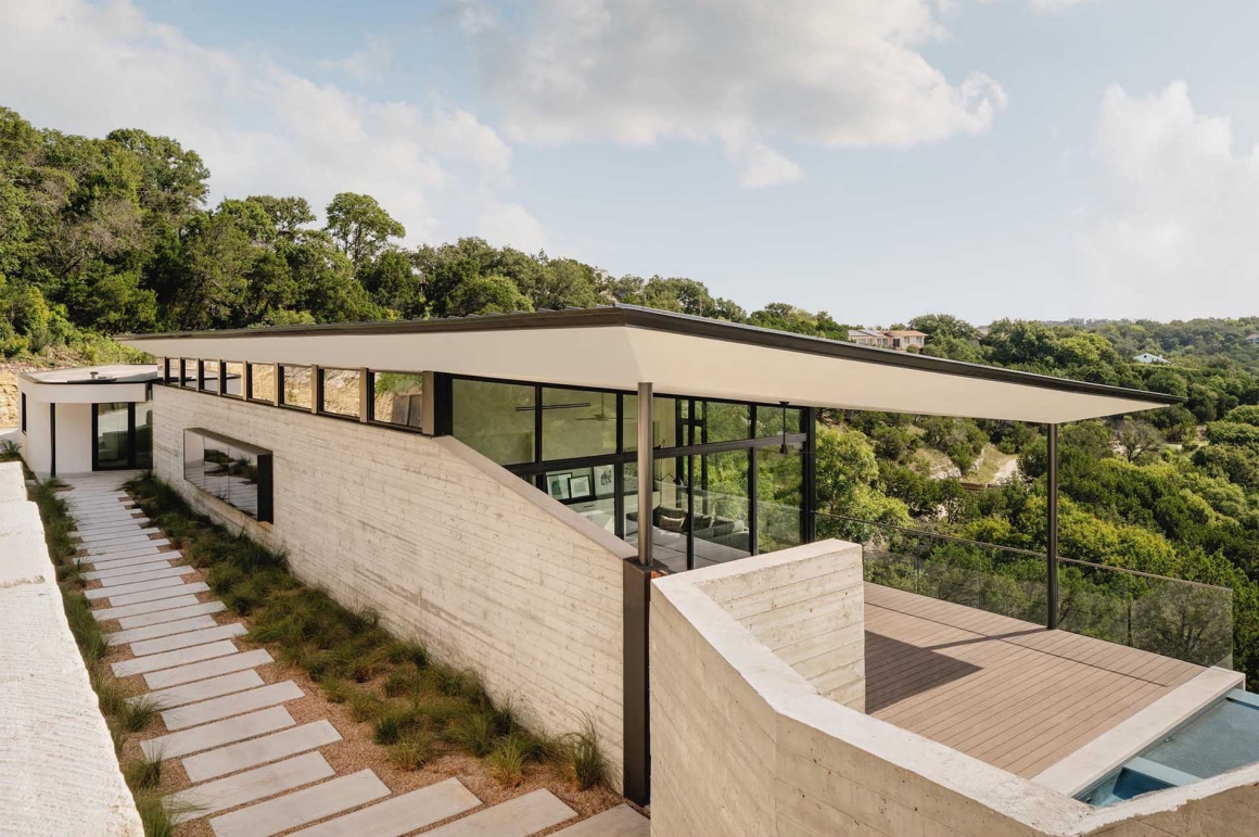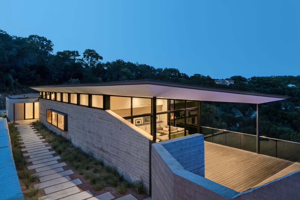 Một con đường trải đầy cỏ chạy dọc theo ngôi nhà và bức tường bê tông giả gỗ và dẫn đưa ta đến lối vào bằng bức tường nổi bật bằng gỗ. Phía hẻm núi của ngôi nhà có kính kịch trần mang tới tầm nhìn không bị cản trở ra hẻm núi và thành phố Austin. Vị chủ nhân cũng có thể thưởng ngoạn quang cảnh này từ hồ bơi nằm ở đầu còn lại của ngôi nhà.