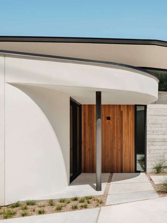 ình dạng của ngôi nhà làm nổi bật độ cong tự nhiên của khu đất, trong khi những bức tường cao nối với cửa sổ bằng gỗ tạo khoảng đệm giữa con đường sầm uất liền kề đồng thời cân bằng ánh sáng suốt cả ngày.