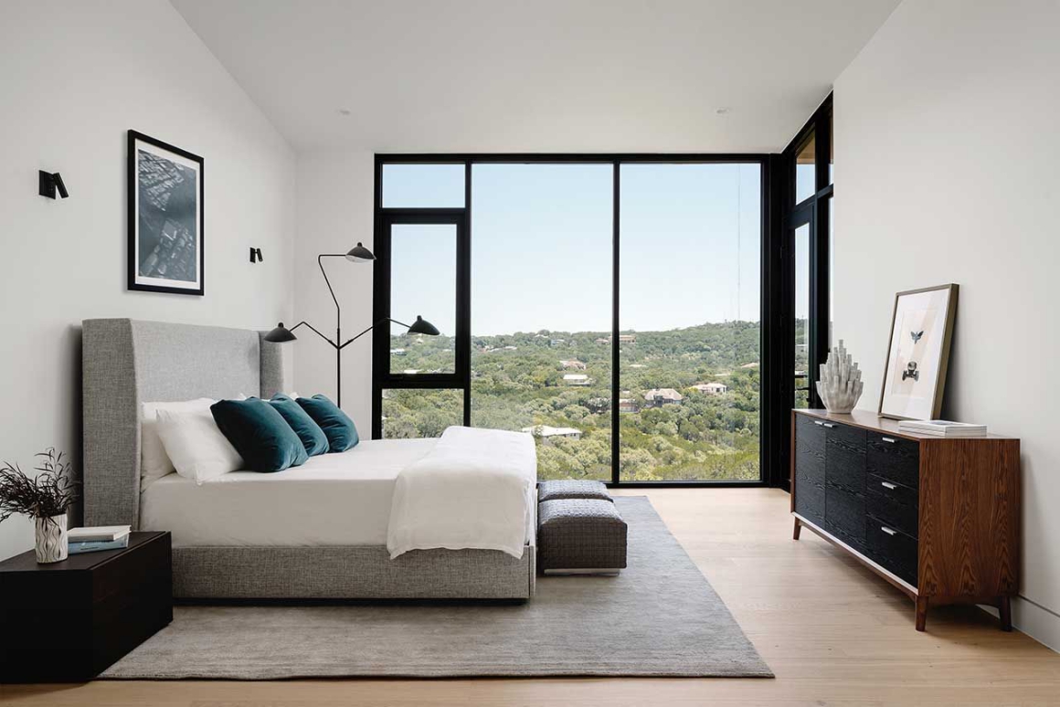 Ở một trong các phòng ngủ, cửa sổ kính suốt kịch trần cho phép thưởng ngoạn trọn vẹn quang cảnh cây cối từ giường ngủ. Trong khi đó, ở phòng tắm, một chiếc gương lớn giúp phản chiếu ánh sáng cũng như tầm nhìn qua các khung cửa sổ lớn.
