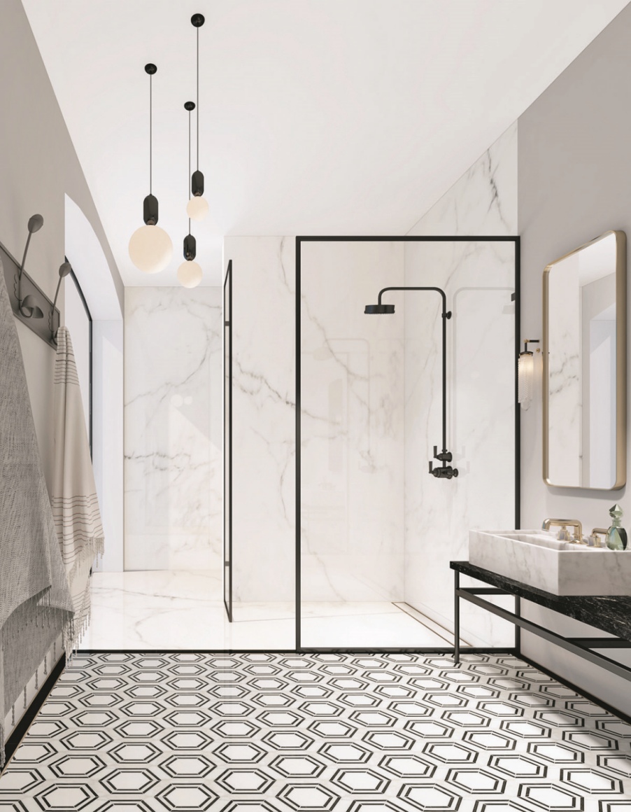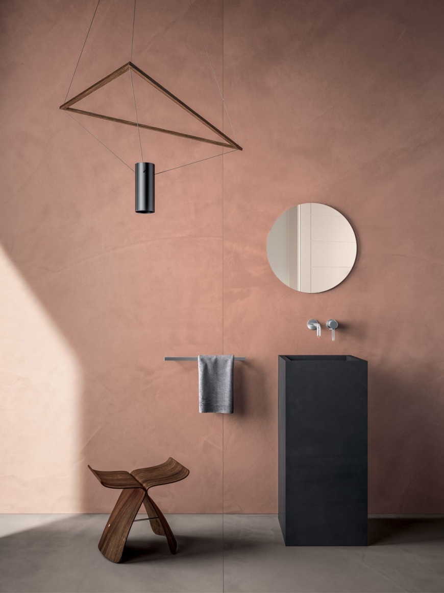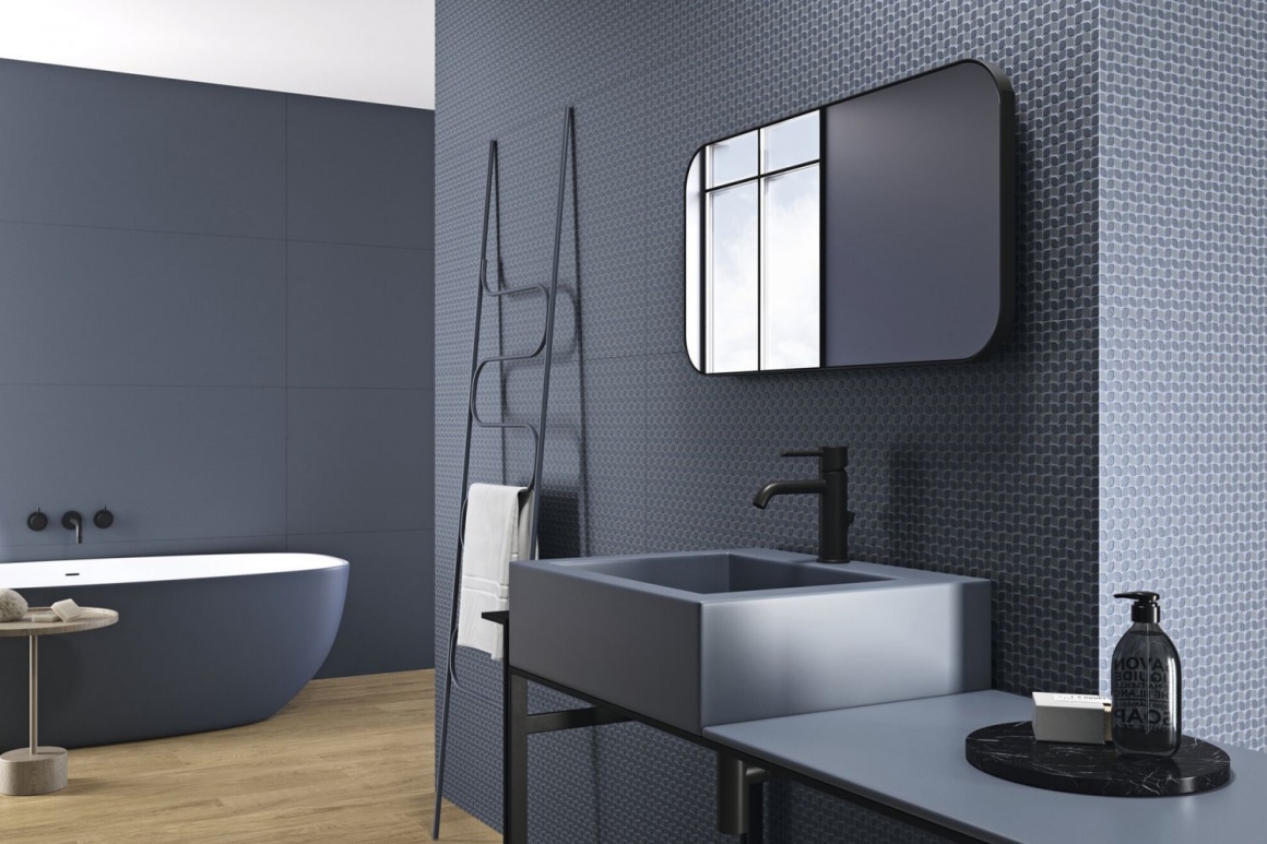 Một phòng tắm đơn sắc có thể được cấu thành từ nhiều loại vật liệu bề mặt khác nhau. Các loại đá giả như Dekton và Silestone của Consentino là một gợi ý hay để bổ sung cho không gian này. Bên cạnh đó, bộ sưu tập gạch khảm và gạch xi măng của Bisazza cũng là một lựa chọn đầy phong cách cho phép tạo ra những tác phẩm nghệ thuật đơn sắc ngay trên sàn hoặc tường.