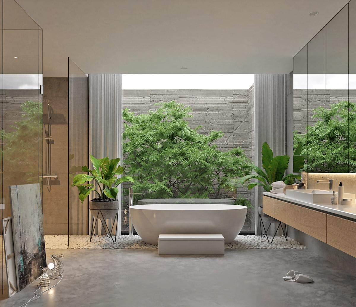 Guồng quay công việc bận rộn và cuộc sống nhiều áp lực đang dần là một “đặc sản” trong thời đại hiện nay. Do đó, nhiều gia chủ mong muốn theo đuổi phong cách thân thiện và gần gũi với thiên nhiên. Ý tưởng thiết kế phòng tắm với không gian xanh chắc chắn sẽ giúp bạn đắm chìm trong sự tươi mát và thư giãn hàng ngày. Dạng phòng tắm này thường xuất hiện những vật liệu tự nhiên và bền vững như sỏi, gỗ. Sỏi được lát ở một góc sàn hay một phần tường sẽ mang lại cảm giác thư giãn và mát mẻ. Gỗ lát cho nội thất gợi nên những điều mộc mạc và thân thiện. Lựa chọn một loại cây phù hợp sẽ giúp nơi đây thêm thoáng mát và có thêm nhiều nguồn năng lượng tích cực cho cuộc sống. Cùng với đó, phòng tắm sở hữu cửa sổ hướng ra ngoài trời cũng mang đến nhiều không khí trong lành cho bạn.