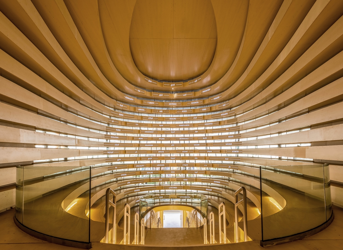 Không gian triển lãm đồ sộ cao 20m gây ấn tượng với cấu trúc hình nón được làm bằng những cây gỗ khổng lồ, vô cùng nổi bật trong không gian ngoài trời. Ở bên trong, du khách được mời đóng góp một từ hoặc cụm từ khi bước vào không gian trung tâm qua các phát minh được sáng chế bởi AI (trí tuệ nhân tạo). Không chỉ vậy, những vần thơ, những bài thơ nổi tiếng cũng được chiếu sáng bằng hệ thống đèn LED, sáng rực cả vùng trời khi về đêm.