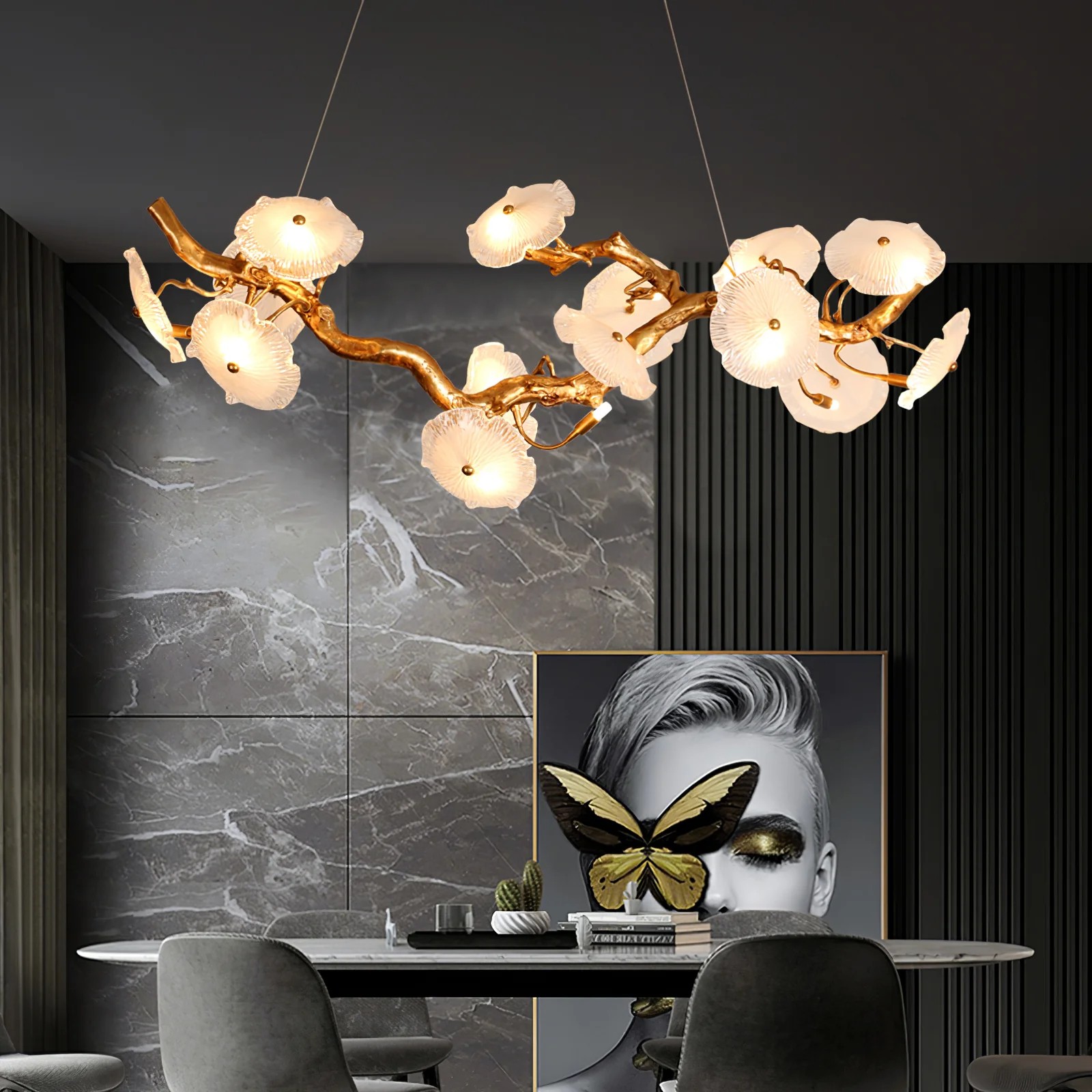 Tác phẩm nghệ thuật không nhất thiết phải giới hạn ở những bức tranh truyền thống trên tường. Gwen Tan, nhà đồng sáng lập Formwerkz Architects cùng công ty thiết kế nội thất Studio iF, nhấn mạnh: “Những chiếc đèn nghệ thuật có thể được xử lý giống như những tác phẩm điêu khắc, tạo ra sự kịch tính phù hợp cho từng không gian trong ngôi nhà”. Minh chứng rõ ràng điều này, đèn Roll & Hill Cora, đèn chùm Serip Organic Lighting Nenufar Blooming là hai trong nhiều sản phẩm được nhà thiết kế này ưa chuộng, vì hình dáng hữu cơ vô cùng hút mắt.