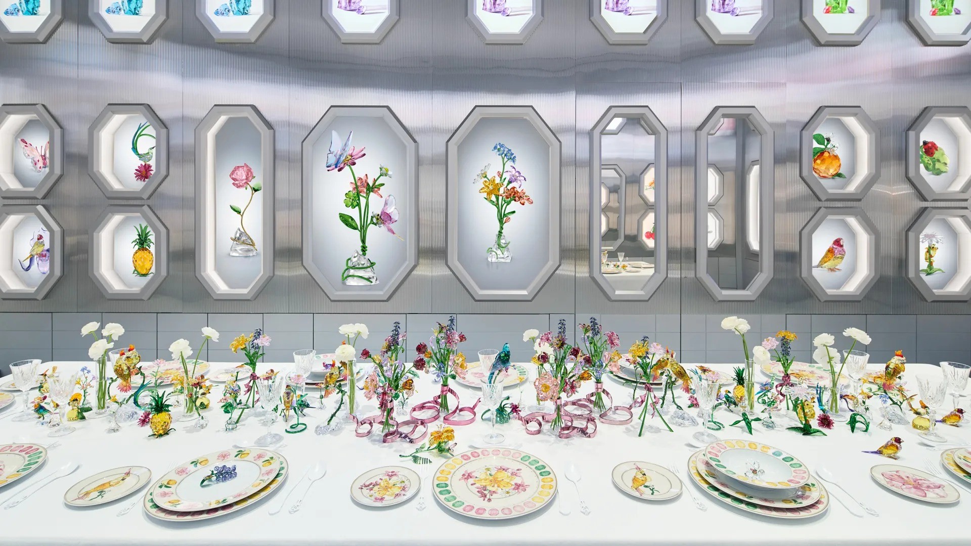 Sản phẩm trang trí nhà ở Spring/Summer 2025 Idyllia mới, nổi bật họa tiết trái cây, chim chóc và hoa cỏ, được Swarovski trưng bày tại Swarovski Duomo, Milan