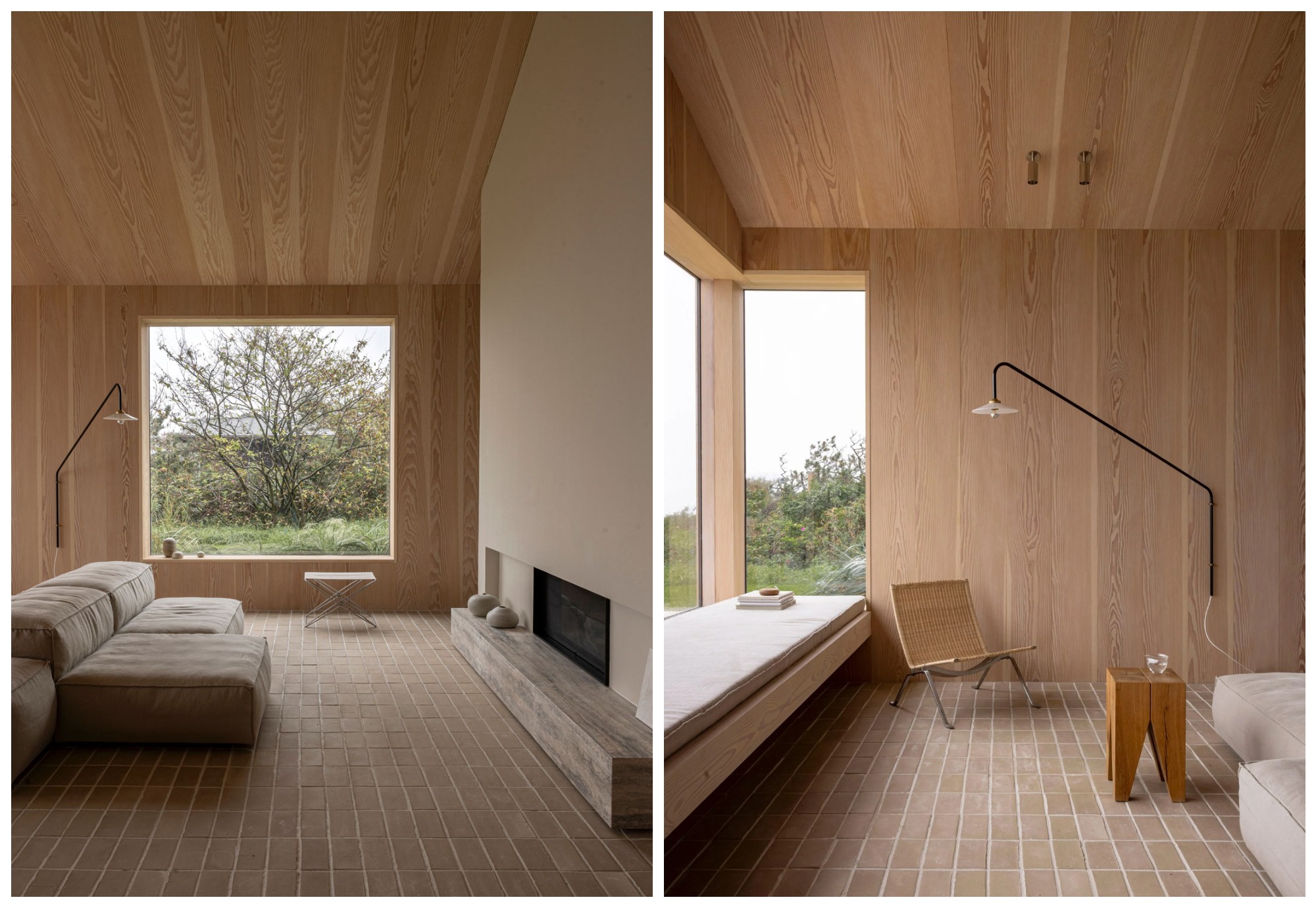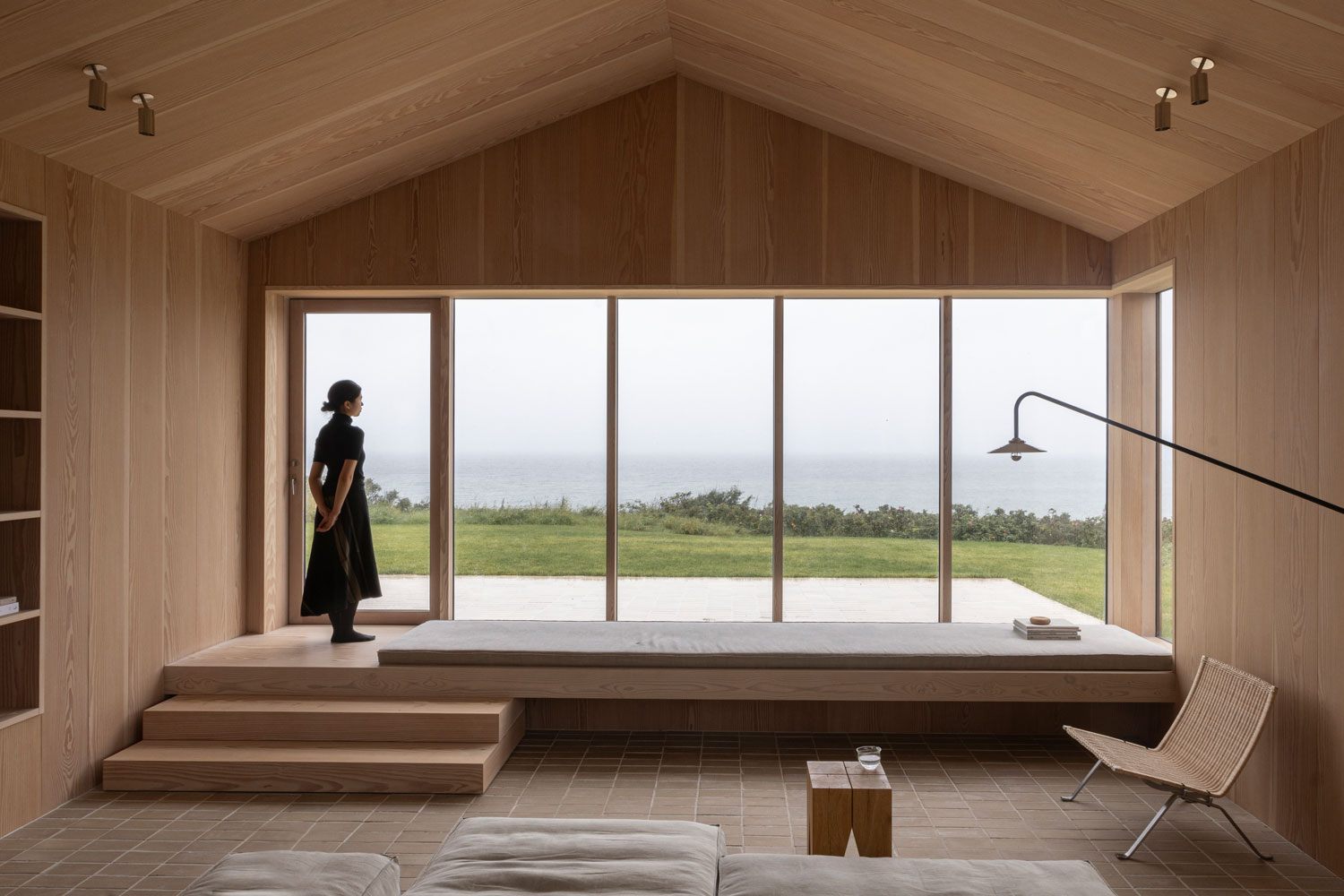 Ở phòng khách hướng ra biển, studio đã kết hợp sàn gạch và tường gỗ với nội thất hiện đại như Đèn treo Valerie Objects, các vật liệu trang trí từ studio thiết kế Muller Van Seriousn.
