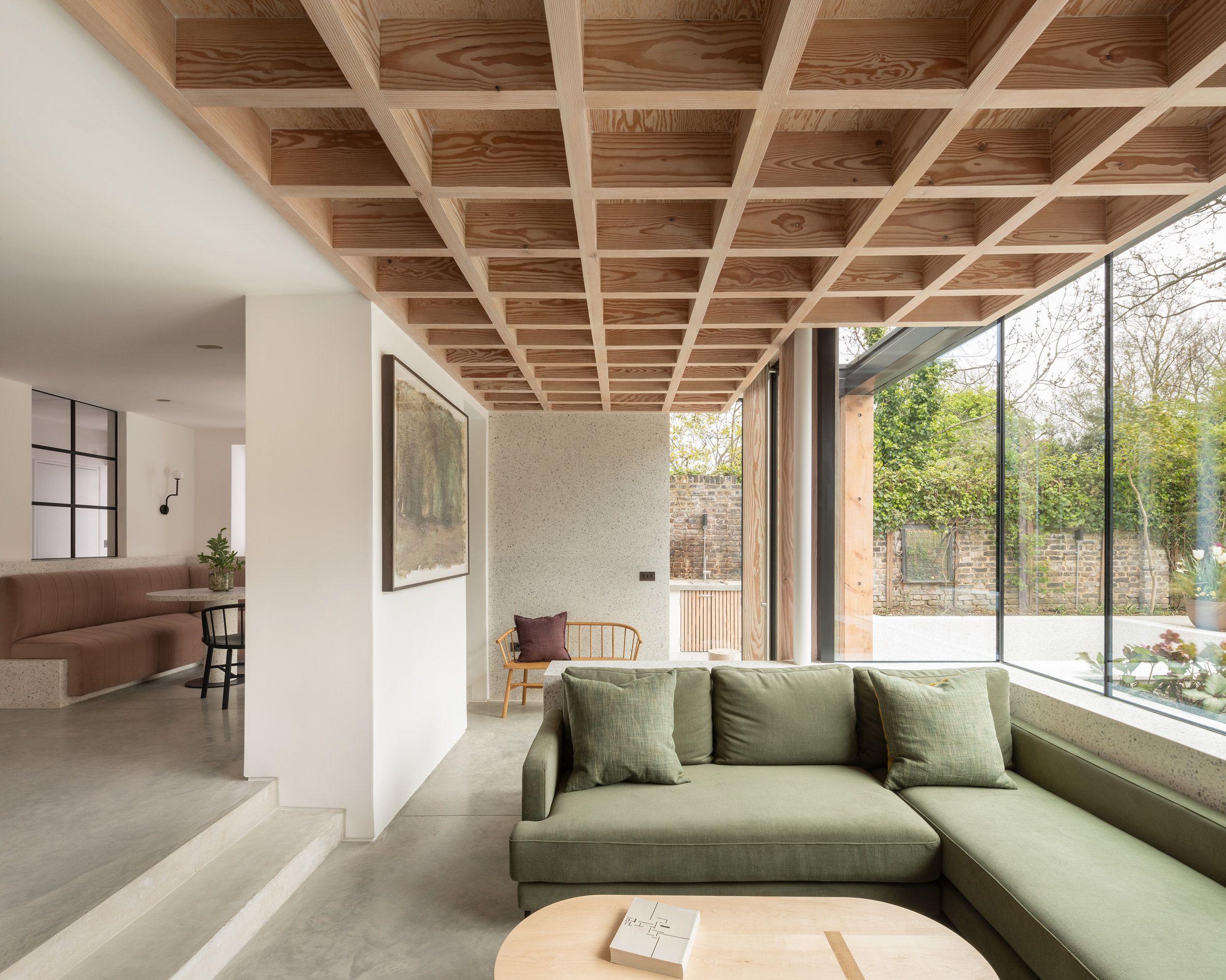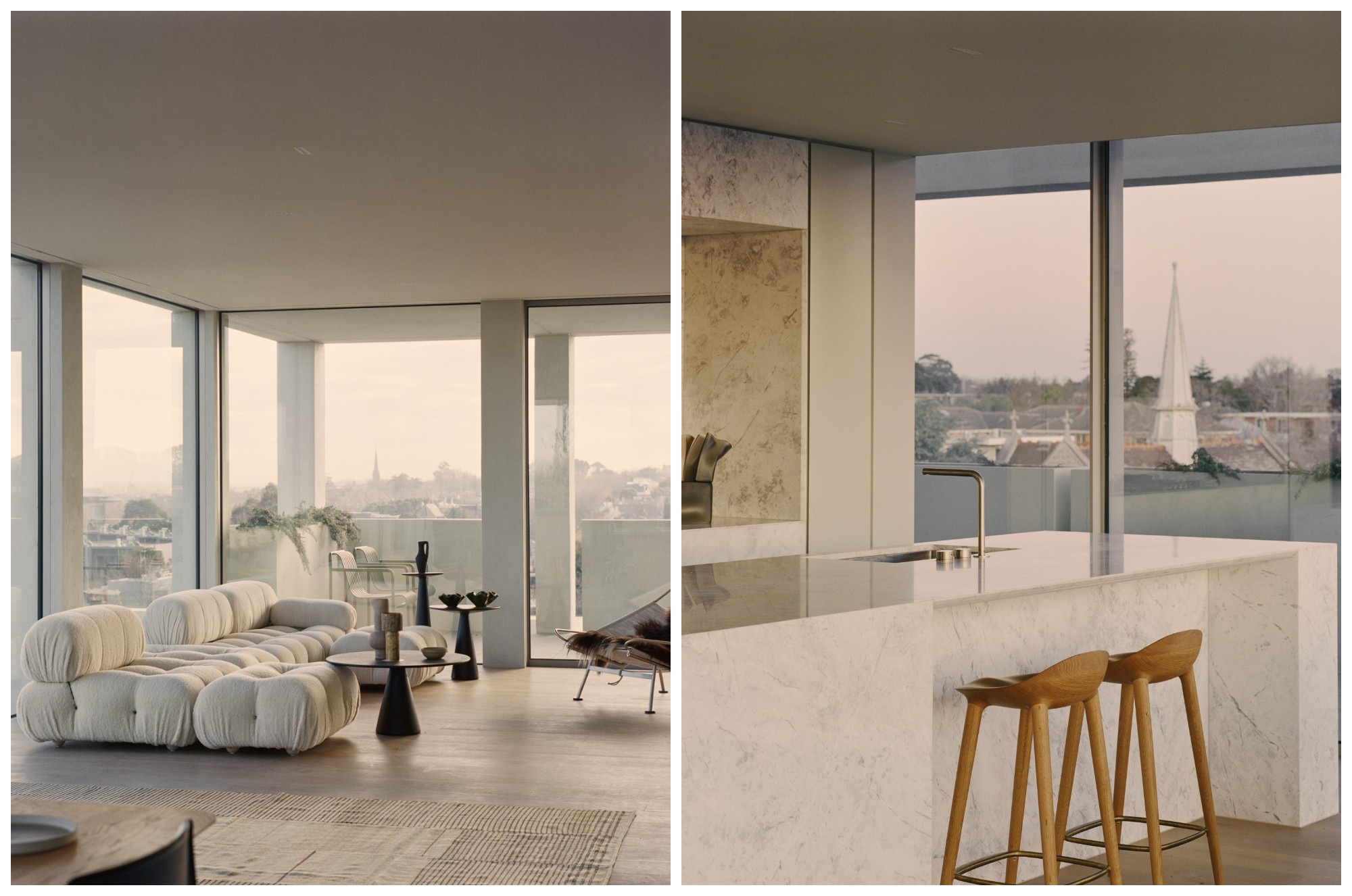 Nội thất của căn hộ ở Melbourne này tạo nên sự tương phản nhẹ nhàng hơn với mặt tiền bê tông có lưới. Một chiếc ghế sofa tròn với hình dạng nhấp nhô được đặt cạnh những chiếc bàn bên hình nhánh cây và chiếc ghế Flag Halyard cổ điển của nhà thiết kế Hans J Wegner.