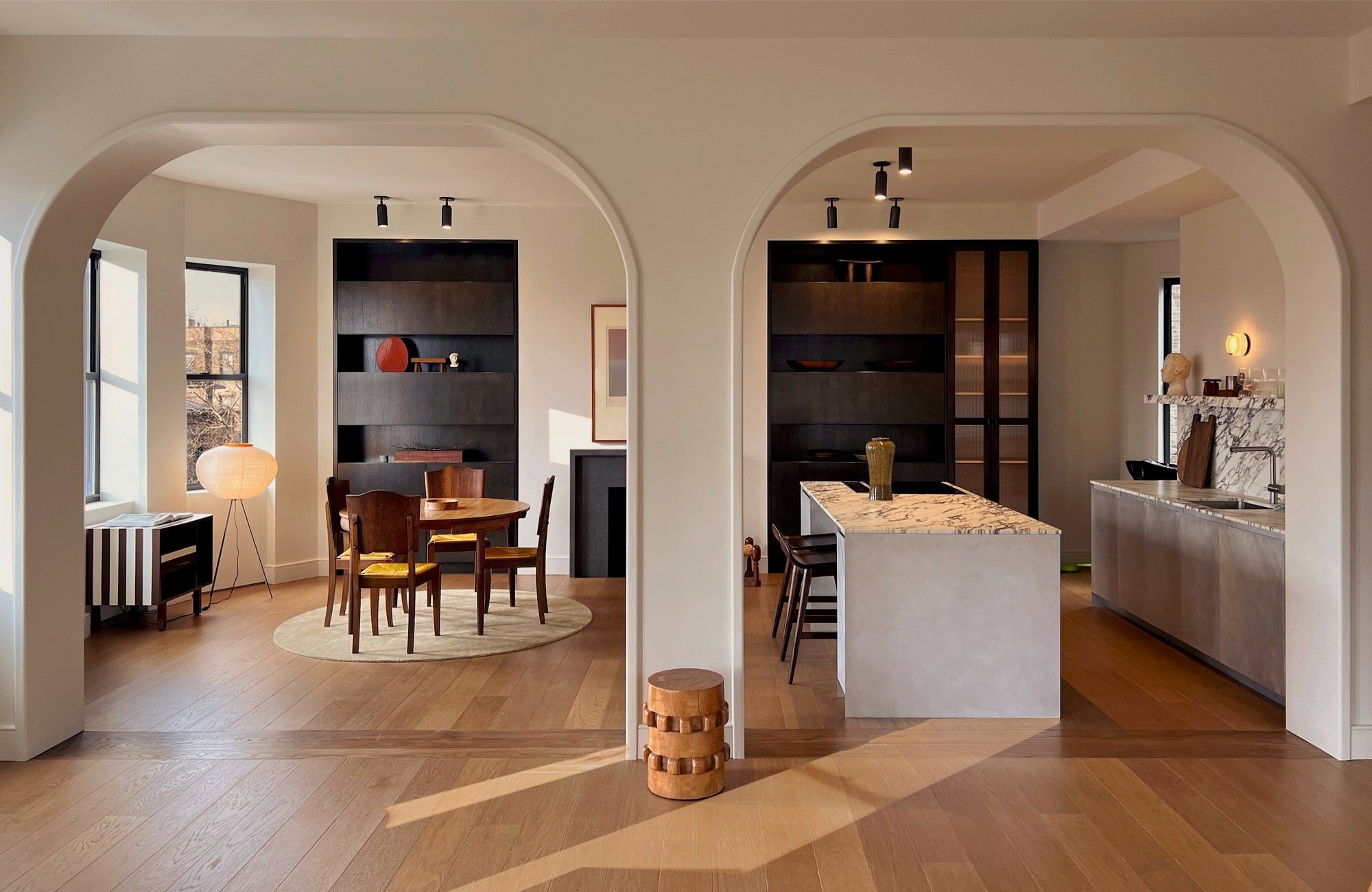 Ở đây, chiếc đèn gạo Akari của nhà thiết kế Isamu Noguchi có thân tre phù hợp với chiếc ghế và chân gỗ, tương phản với chiếc bàn đá cẩm thạch màu xanh lá cây.