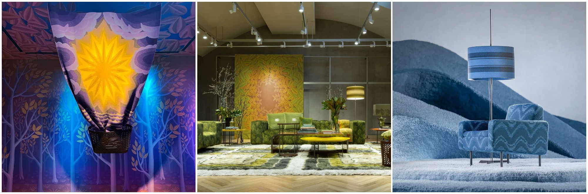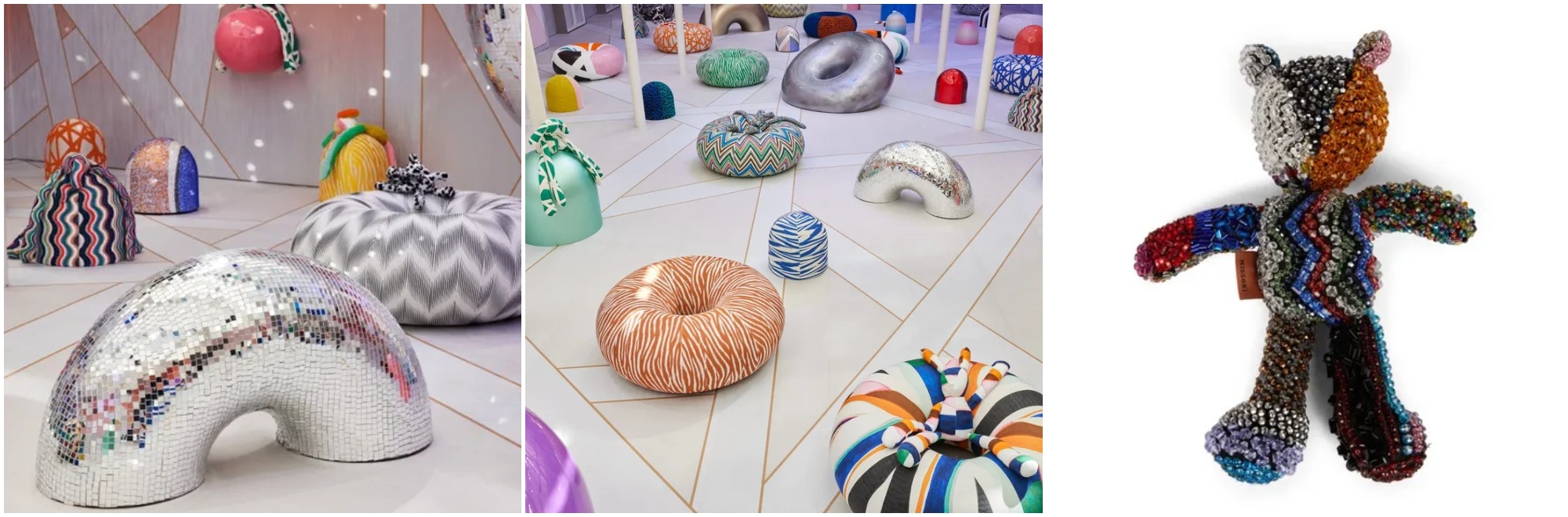Giám đốc sáng tạo của Missoni, Alberto Caliri đã lấy cảm hứng từ các loại bánh kẹo nổi tiếng với nhiều màu sắc sặc sỡ để giới thiệu đến khách tham quan một không gian kỳ diệu và đầy thú vị. Tất cả những món đồ bên trong được kết hợp hài hòa cùng phong cách trang trí khéo léo đã tạo ra hiệu ứng 3D, trải dài từ ghế ngồi cho đến bộ sưu tập Nastri mới. Tại đây, một phong cảnh giả tưởng được thiết lập từ những hình dạng và sinh vật khác thường, vừa lơ lửng vừa định vị trên mặt đất. Bức tranh siêu thực này xoay quanh dòng sản phẩm túi xách dệt may thủ công mới có thiết kế mô phỏng theo chiếc bánh rán hoặc bánh panettone. Người xem khi ghé thăm gian hàng của Missoni dường như đang lạc bước vào một “Thế giới thần tiên”, nơi mang đến bầu không khí vui tươi, hạnh phúc và xóa tan mọi buồn phiền. Bên cạnh đó, mọi người cũng có thể đi dạo xung quanh và mua sắm những món đồ lưu niệm ưng ý như đệm êm ái, gấu bông mềm mại, cốc và nến thơm.