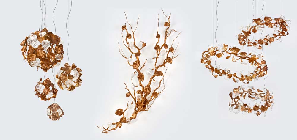 Mỗi một thiết kế trong bộ sưu tập được chia thành 3 hoặc 4 kích thước khác nhau để phù hợp với nhiều diện tích không gian. Trước hết hãy nói về Orbifolia xinh xắn tựa như một chiếc kén tròn xinh kết từ lá vàng và trắng, ôm ấp bên trong vầng ánh sáng ngọt ngào. Tiếp đến là Makoyana đơn giản như một nhành cây vừa được hái xuống, giữ trọn được nhựa sống ngát hương. Ornata ngả màu u buồn như một nàng thơ giữa trời thu se lạnh, trong khi Aurea lại vẹn tròn tựa như vòng nguyệt quế của nữ thần mùa xuân trong độ rực rỡ nhất đời. Chiếc đèn Medallion thanh lịch nhã nhặn chắc chắn sẽ là điểm nhấn tuyệt vời cho phòng khách nhà bạn, trong khi thiết kế Majestica lại biểu diễn vẻ đẹp sung mãn của một nhánh Calathea trưởng thành. Và không thể không kể đến Tree of Life – “Cây sự sống” nổi danh trong thần thoại cũng xuất hiện tại đây, khéo léo “khoe” những chiếc lá được chế tác tỉ mỉ trên những cành cây uốn lượn và sẽ là tiêu điểm chú ý trong các gian phòng cổ điển.