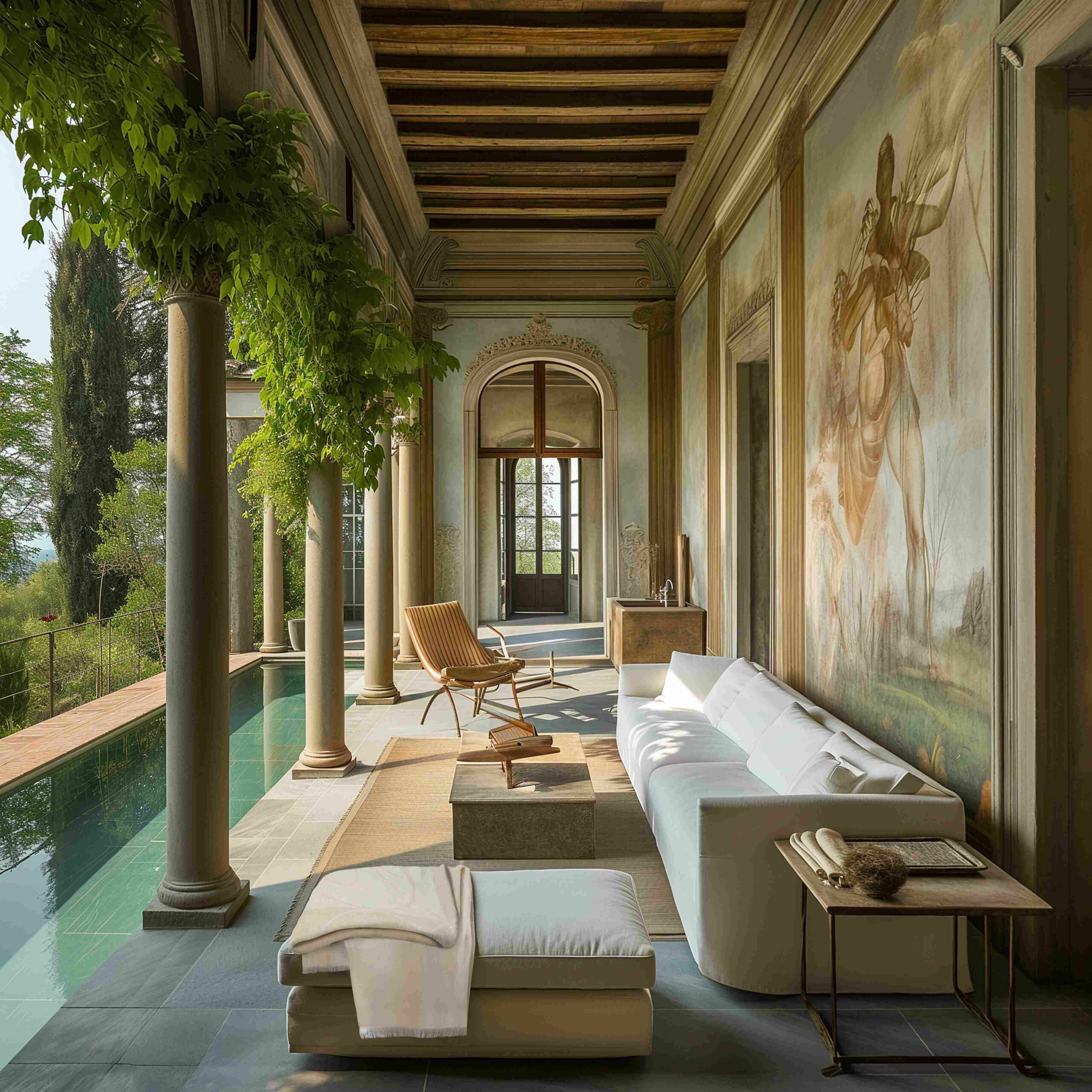 Đắm mình trong ánh nắng Địa Trung Hải và tràn ngập những chi tiết trang trí quen thuộc đặc trưng nước Ý, như vô số bức bích họa và sàn đá mòn, villa trang bị nội thất theo phong cách hiện đại, phù hợp lối sống ngày nay. Hiện diện khắp mọi góc không gian ngôi nhà, các thiết kế khăn trải giường và khăn tắm nổi tiếng nhất của Pratesi, từ Tre Righe mang họa tiết ba đường do Coco Chanel ủy quyền thiết kế cho căn hộ Paris của bà đến Treccia, nổi bật đường thêu kiểu bện bên cạnh viền hình vỏ sò, khiến ta không thôi mơ mộng về mái ấm bình yên.