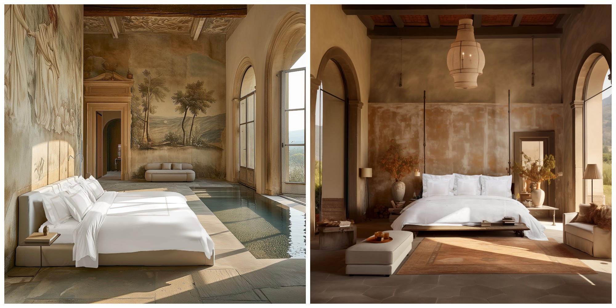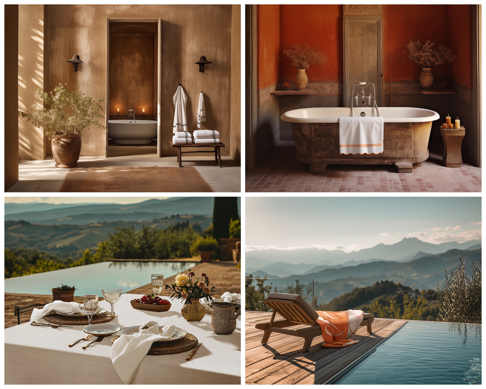 Ali, linh hồn sáng tạo của Reverse Orientalism, đã lấy bản tóm tắt ngắn gọn trên đây để tạo ra một biệt thự AI nhưng toát lên cảm giác rất thật. Cô đã dành khoảng một tháng để chọn trước các hình ảnh đồng thời tỉ mỉ hiệu chỉnh các hình ảnh trực quan của AI. Cô giải thích: “Nói đúng ra, quá trình tạo hình ảnh bằng AI hầu như không mất thời gian, nhưng để có kết quả như mong muốn thì cần phải thử nghiệm rất nhiều, khoảng từ 5 đến 10 giờ mỗi ngày”. Tất cả hướng đến mục đích lồng ghép chút gì đó mới mẻ, hiện đại vào diện mạo cổ điển. Ali nhấn mạnh: “Tôi muốn tạo ra thứ gì đó với những đường nét gọn gàng, không cầu kỳ, phản ánh ngôi nhà thuộc sở hữu những vị khách hàng quý tộc ban đầu của Pratesi. Tôi đã lên ý tưởng về một môi trường giống như spa, loại hình bất động sản vốn được xây dựng như một nơi nghỉ dưỡng ở vùng nông thôn, và giờ đây đóng vai trò cánh cổng dẫn đưa mọi người về quá khứ”.