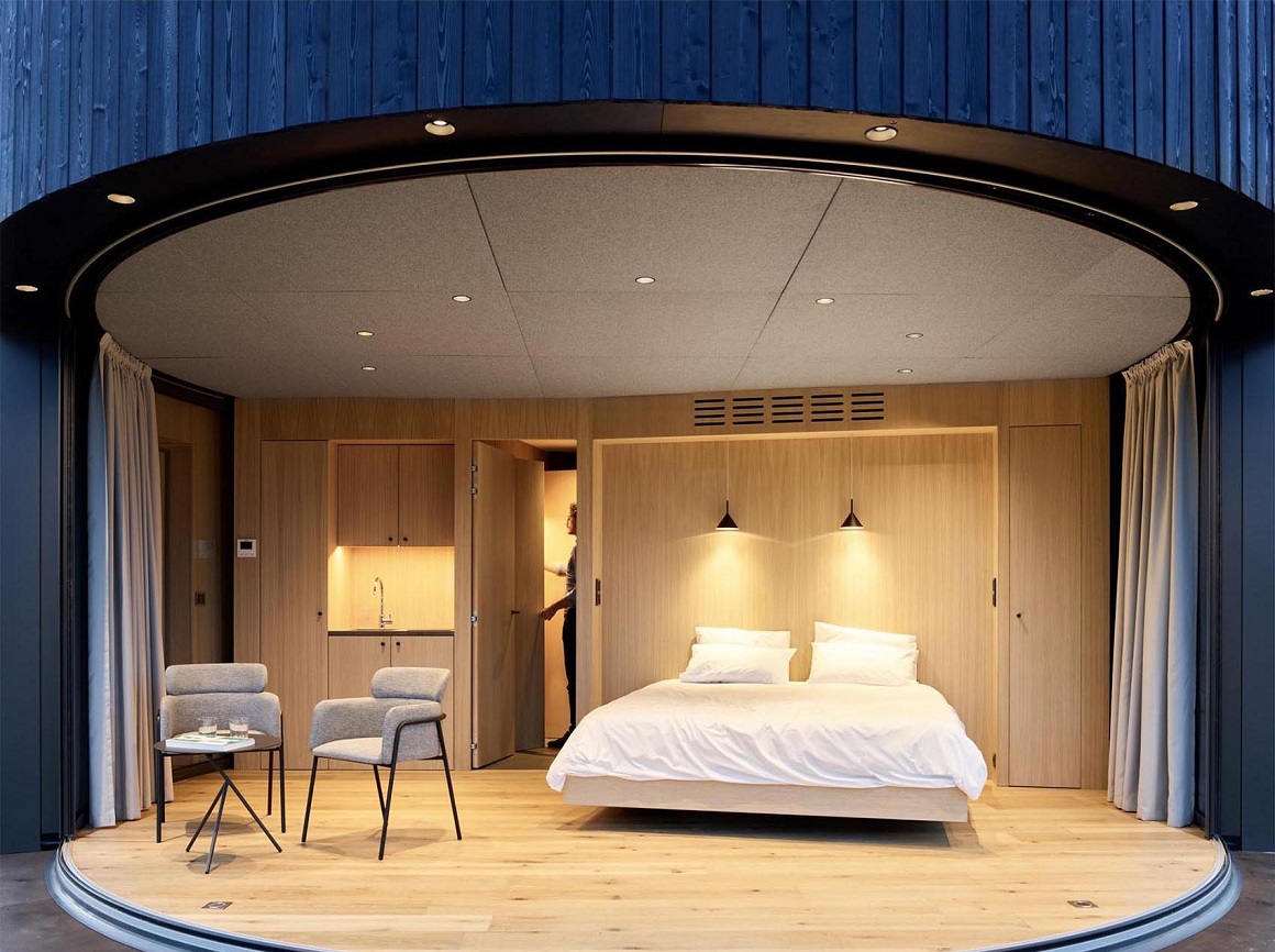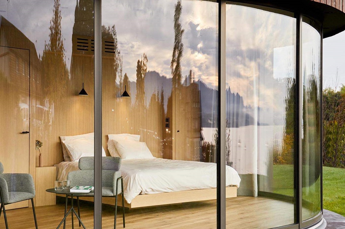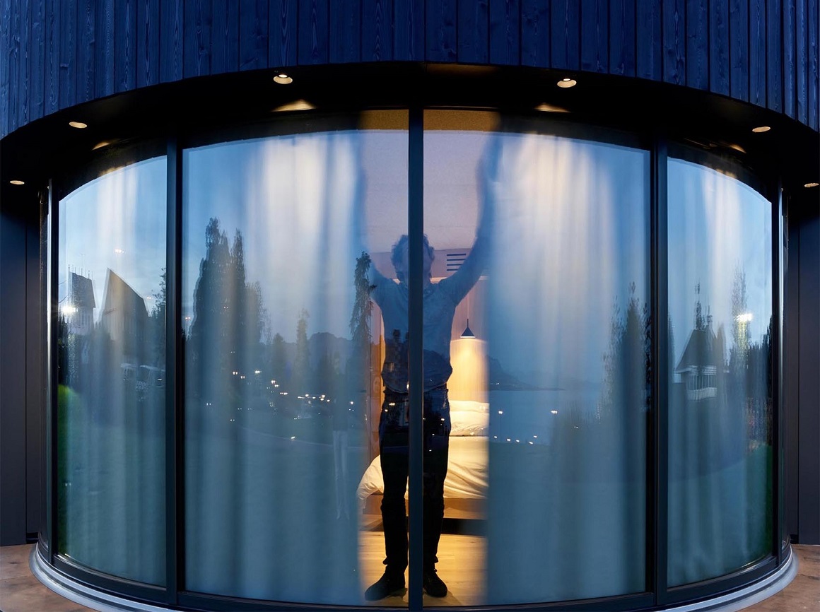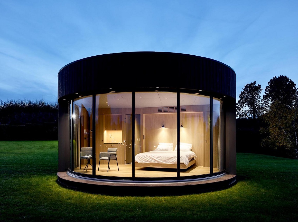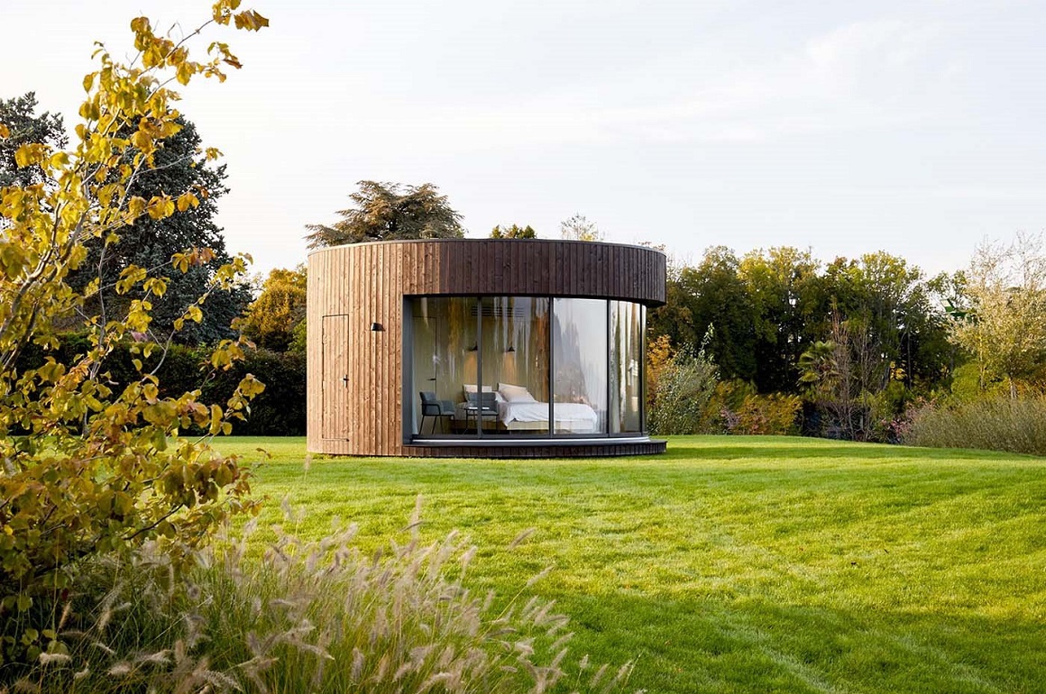 ộng 26 mét vuông, cabin có thiết kế hình tròn, ốp gỗ dọc bên ngoài. Ở phía trước, khung cửa sổ Lumicene 6m cho phép không gian bên trong đôi khi được biến đổi thành không gian ngoài trời ngay tức thì theo sở thích gia chủ.