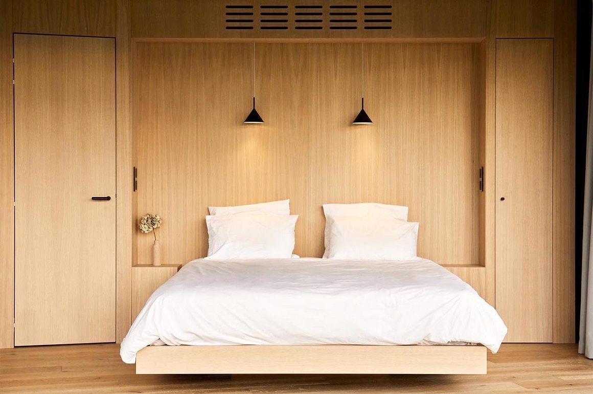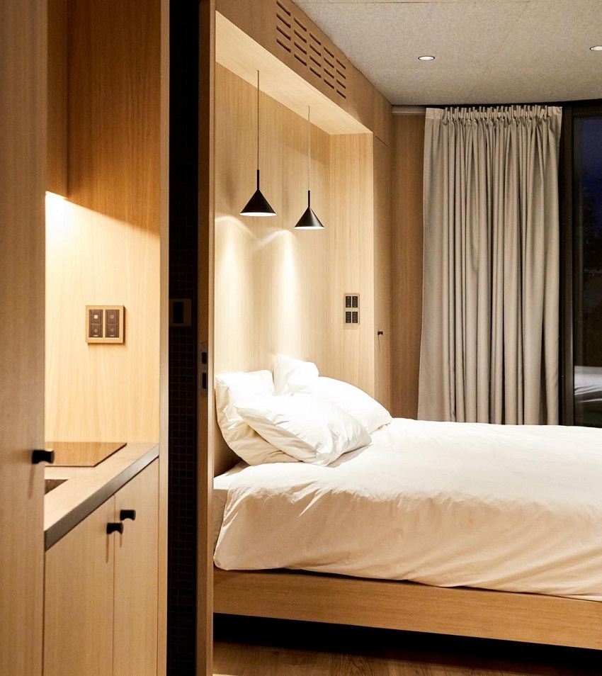 Bên trong, LumiPod 6 gồm đầy đủ phòng ngủ, khu vực bếp, khu vực ăn uống, phòng tắm và tủ quần áo âm tường. Đồ gỗ sồi làm theo yêu cầu, các tấm trần phủ bằng nỉ len và chiếc giường, trông giống như đang nổi, được tích hợp vào một ngách nông.