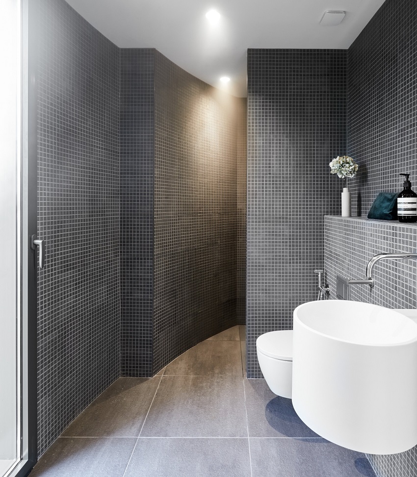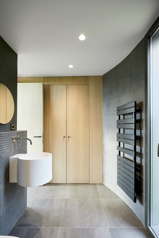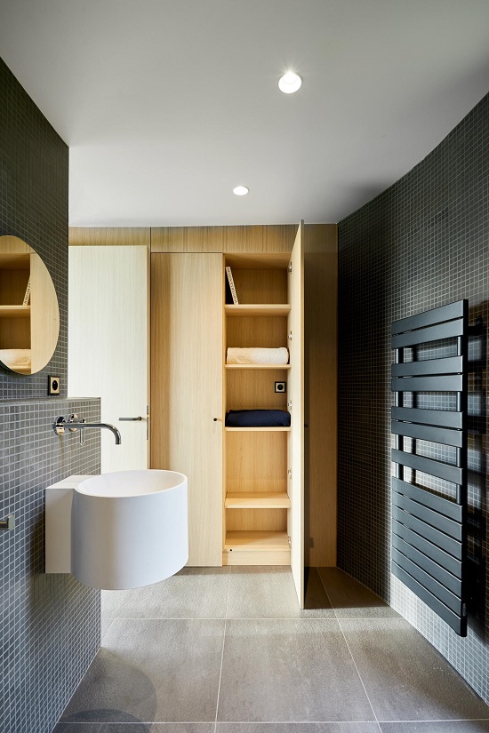 Phòng tắm màu xám, trắng và gỗ nằm phía sau phòng ngủ, có gạch vuông nhỏ ốp từ sàn đến trần bao phủ các bức tường. Cabin còn gây ấn tượng bằng bức tường kính mở hoàn toàn. Tuy nhiên, vị gia chủ hoàn toàn có thể trải nghiệm không gian riêng tư nhờ vào chiếc rèm vải.