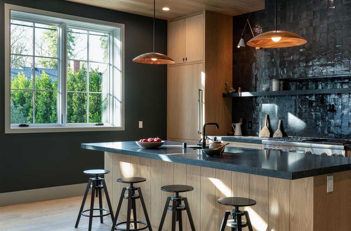 Khu vực ăn uống được bố trí một băng ghế gỗ ở một đầu, ngăn cách phòng khách với nhà bếp. Cửa kính trượt lớn mở không gian bên trong ra khoảng sân. Nhà bếp nổi bật với bức tường gạch Zellige đen, tủ gỗ sồi trắng và mặt bàn đá xà phòng tối màu.