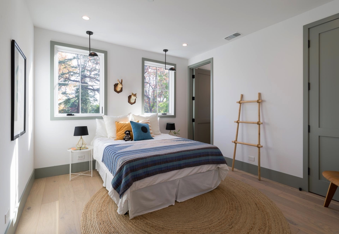Gian phòng chính được bao bọc bởi một trong những cấu trúc khung chữ A và sơn hoàn toàn bằng tông màu Smoke đến từ thương hiệu Farrow and Ball, bổ sung cho tông màu gỗ ấm áp của tường và sàn. Không gian riêng này có tủ sắt đặt riêng trong tủ quần áo không cửa ngăn lớn và hai sân hiên ngoài trời nhìn ra cả sân trước lẫn sân sau.