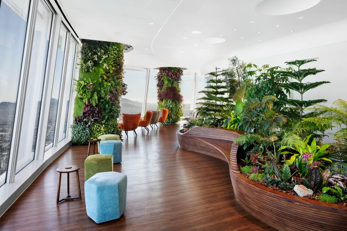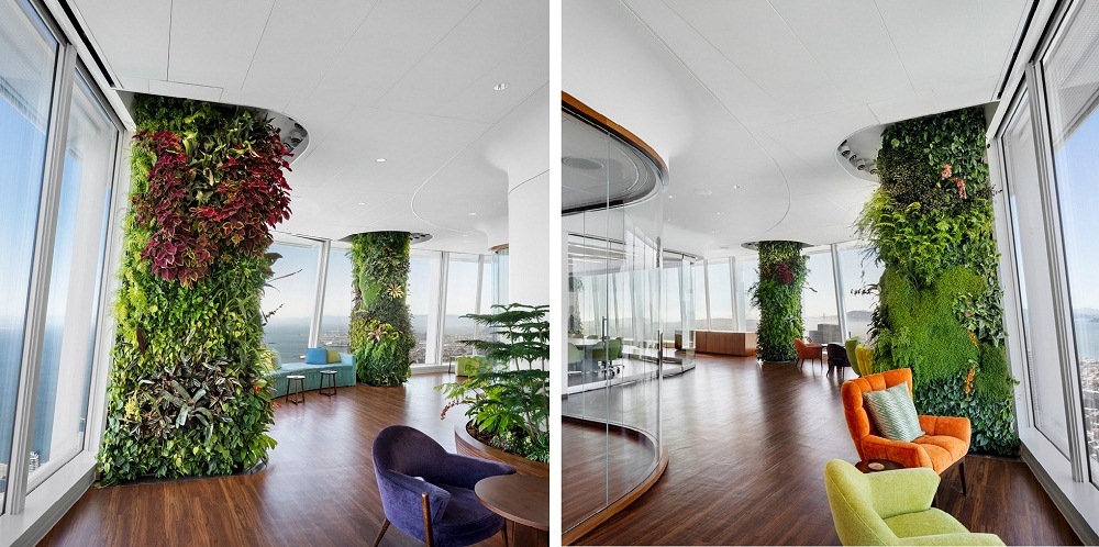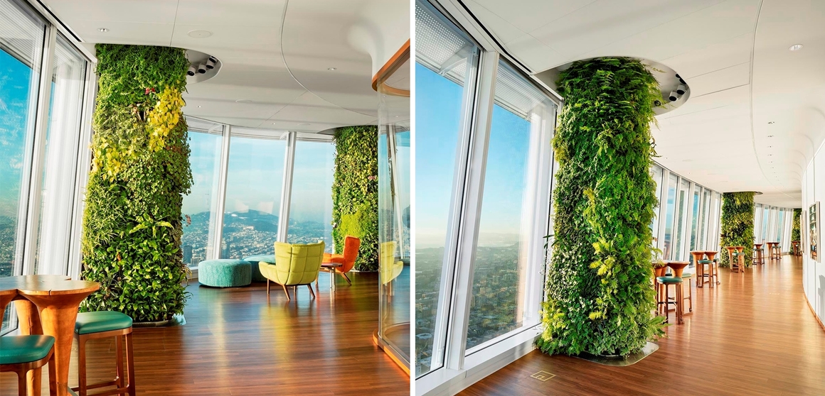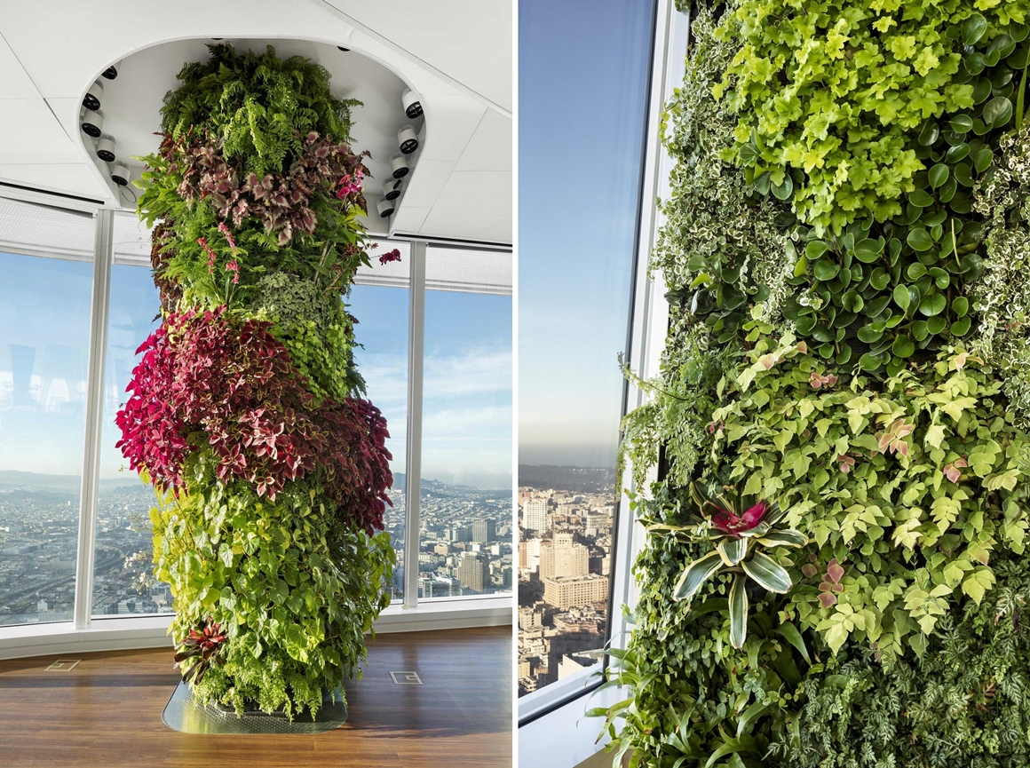 Nhằm mục đích tạo ra một bầu không khí nhiệt đới, các khu vườn thẳng đứng cao 13 feet và sử dụng 25.000 cây để bao phủ 3500 feet vuông không gian hình trụ. Là một không gian pha trộn cho nhiều mục đích sử dụng, các cột cũng là “nguồn nuôi dưỡng” cho cả tòa nhà.