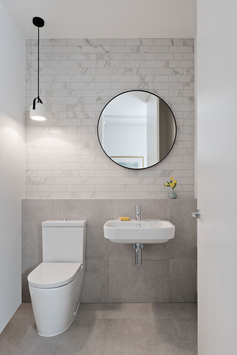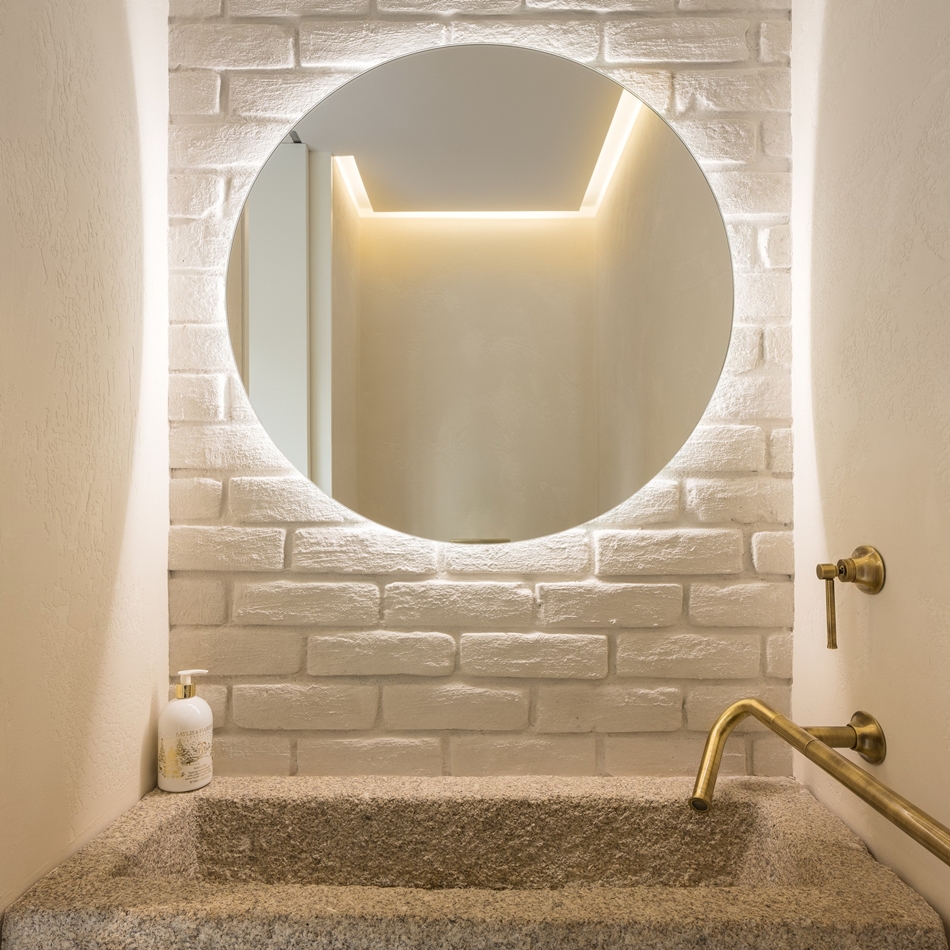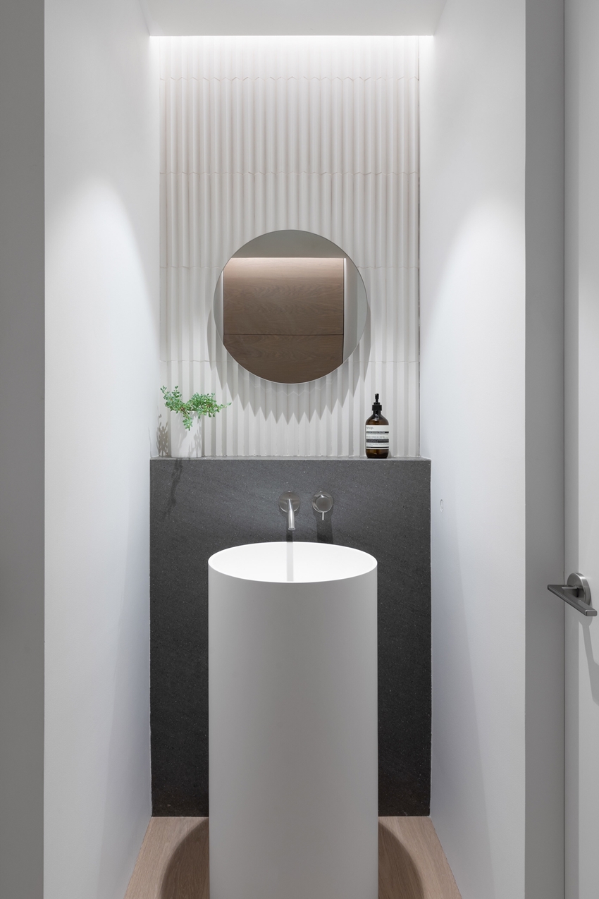 Giúp không gian làm đẹp của phái nữ thêm phần ấn tượng, DLM Architects đã khiến giới thiết kế vô cùng bất ngờ với khả năng sáng tạo của mình khi cải tạo máng đá granit thành bồn rửa. Ngoài ra, tấm gương có đèn nền đóng vai trò là tiêu điểm sáng cho gian phòng này.