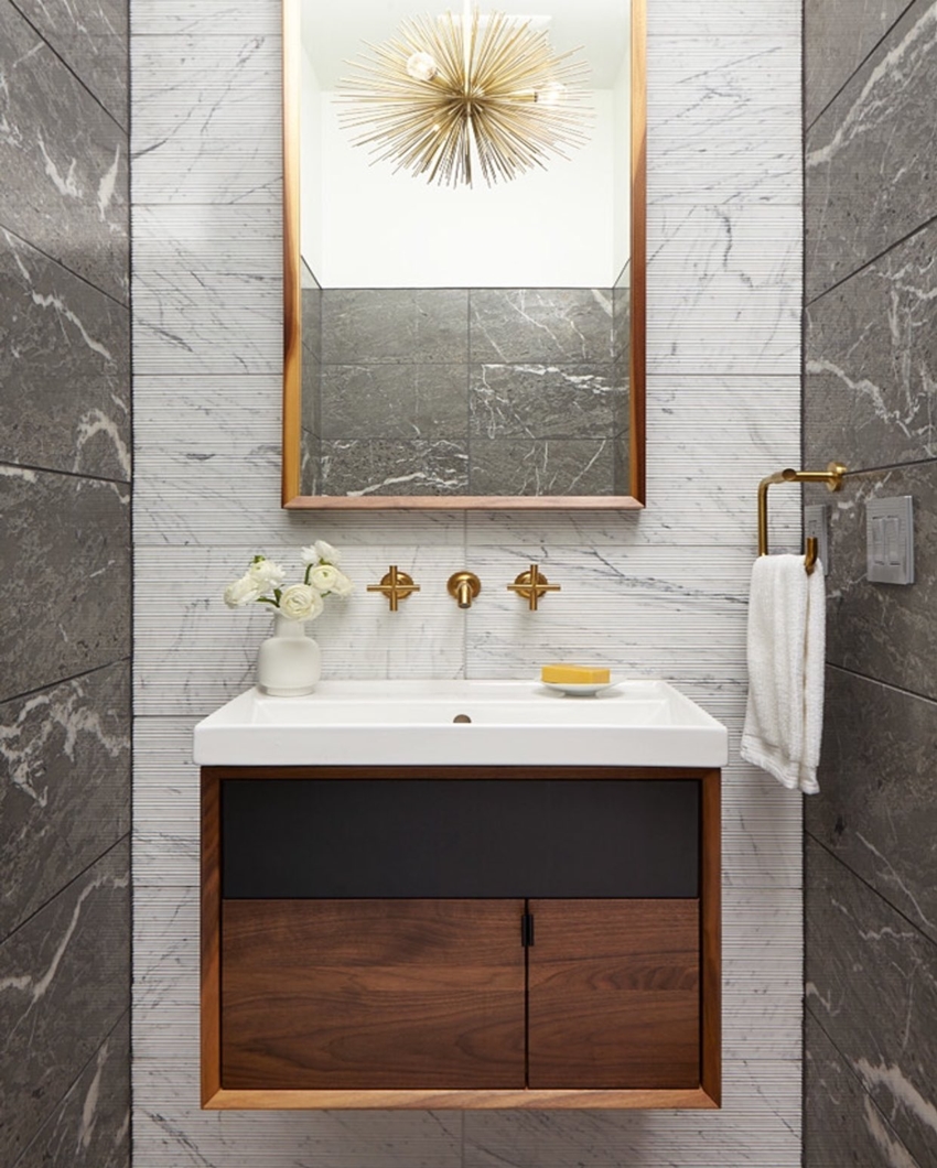 Nhà thiết kế 3Angle Designs thổi sức sống mới vào phòng trang điểm qua cách trang trí gạch Salvatori Romboo với kết cấu giống như tre. Không chỉ vậy, các kiến trúc sư đã lan tỏa hoạ tiết vân đá Marble vào không gian và các điểm nhấn bằng đồng từ thương hiệu Newport Brass.