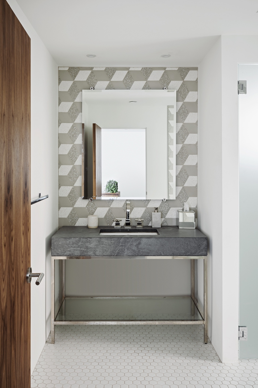 Phòng trang điểm được thiết kế bởi Falken Reynolds Interiors và Randy Bens Architect mang đến một cái nhìn tổng thể độc đáo và mới lạ. Cách chọn bồn rửa có bệ hình khối chữ nhật kết hợp giữa gờ đá Basalt và gạch Mutina xếp ly trên tường một cách logic tạo nên vẻ đẹp phóng khoáng cho gian phòng.