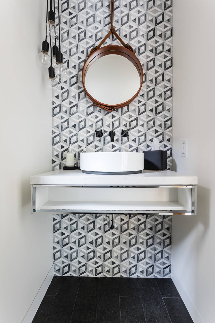 Tạo nên xu hướng lạ mắt cho năm nay, nhà thiết kế The Ranch Mine bao phủ toàn bộ tường bằng những viên gạch hình học vô cùng sống động, với các điểm nhấn bằng chất liệu crôm thu hút mọi ánh nhìn mà không khiến không gian bị ngợp.