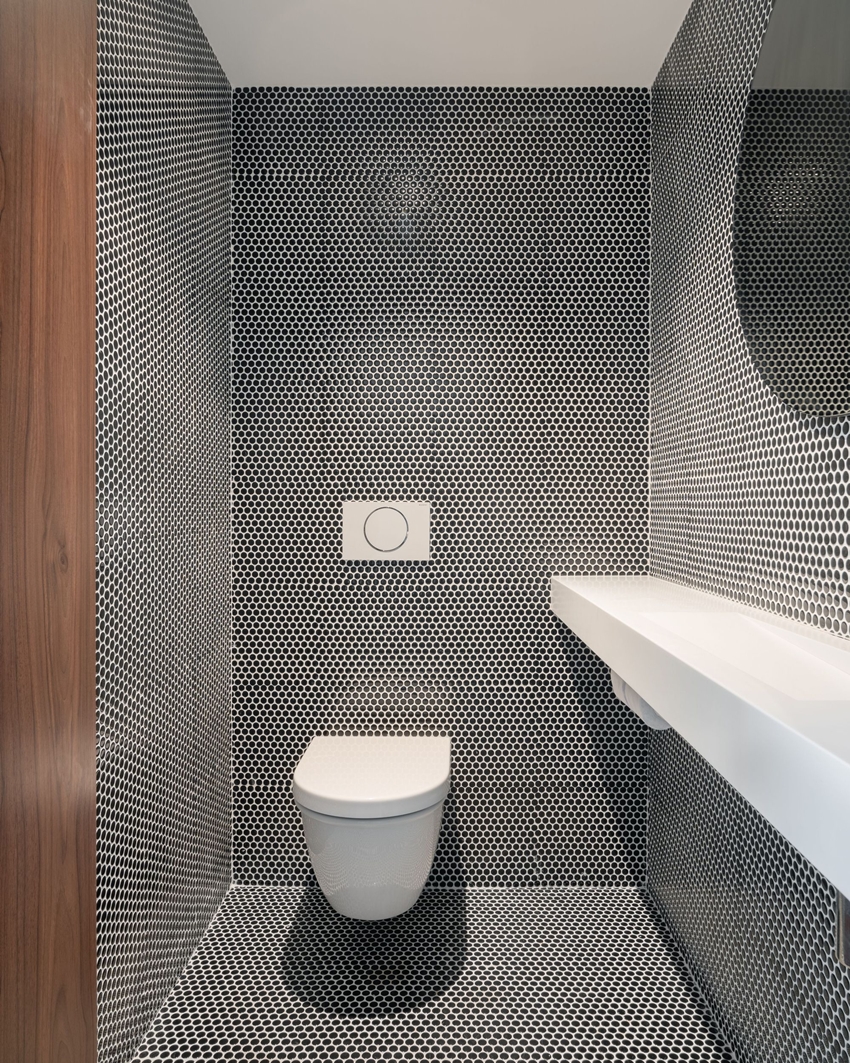Công ty kiến trúc Studio ZADES đã tạo ra hiệu ứng thị giác trong tuyệt tác được thể hiện qua từng viên gạch nhỏ màu đen được ốp tỉ mỉ với vữa trắng bao phủ trên tường và sàn nhà. Được biết, thiết kế này đã gây ấn tượng sâu sắc với gia chủ và những vị khách ghé thăm.