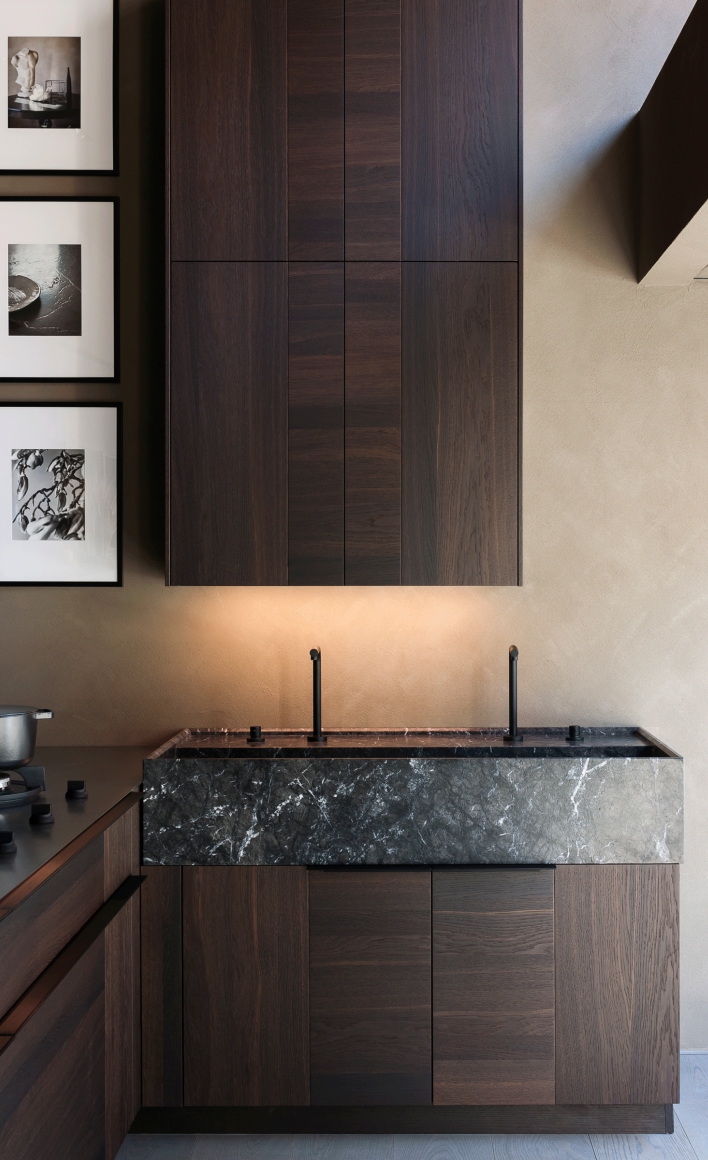 Dòng sản phẩm Cesar’s Intarsio của Espresso Design lấy cảm hứng từ nghệ thuật lát gỗ truyền thống để định hình những cánh cửa với đường vân đặc biệt, kết hợp cùng đá cẩm thạch sẫm màu đã tạo nên một nhà bếp sang trọng và độc đáo.