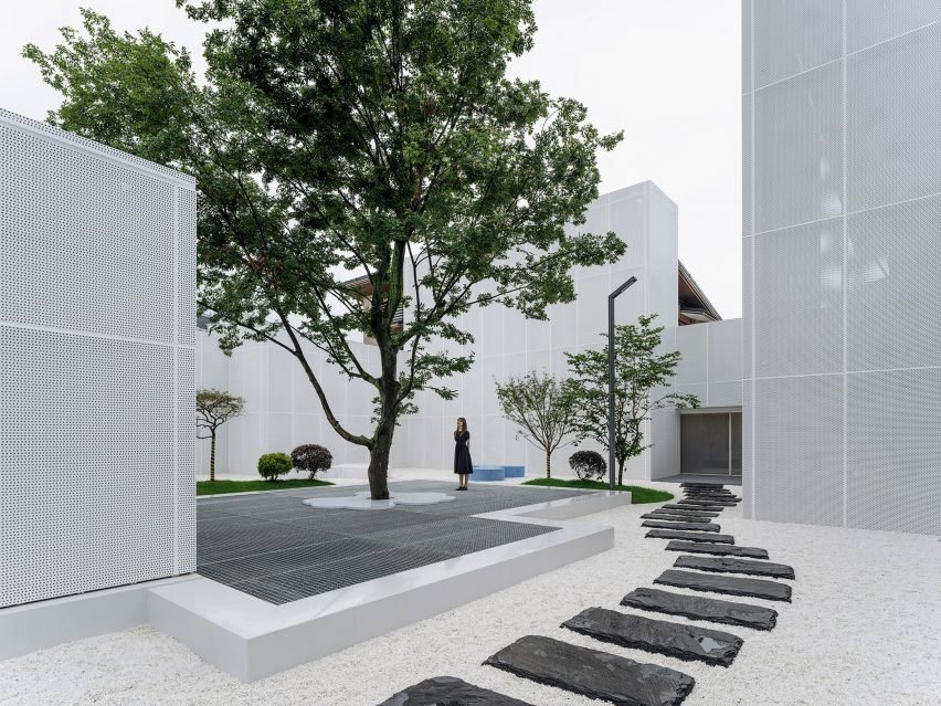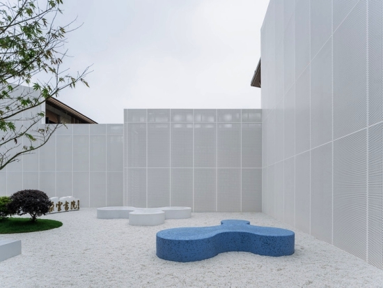 Cây cối và thực vật ban đầu của khu vực được giữ nguyên vẹn trong khoảng sân, đồng thời được bao quanh bởi những viên sỏi trắng gợi nhớ đến tác phẩm của nghệ sĩ triều Minh Qiu Ying. Góc nghỉ ngơi cho khách nay được trang bị hai chiếc ghế mây – một màu trắng và một màu xanh, làm từ nhựa tái chế.