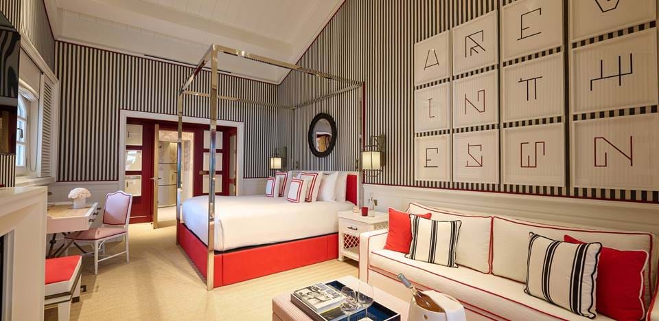 Thiết kế của Luis Bustamante kết hợp tinh thần Riviera cổ điển với sự tiện nghi hiện đại, nổi bật với tông đỏ – trắng – xanh, họa tiết toile de Jouy và những đường sọc thanh lịch. Mùa hè này, khách sạn ra mắt 11 suite mới, nâng tổng số phòng lên 35, phần lớn có sân hiên rộng và tầm nhìn thoáng đãng.