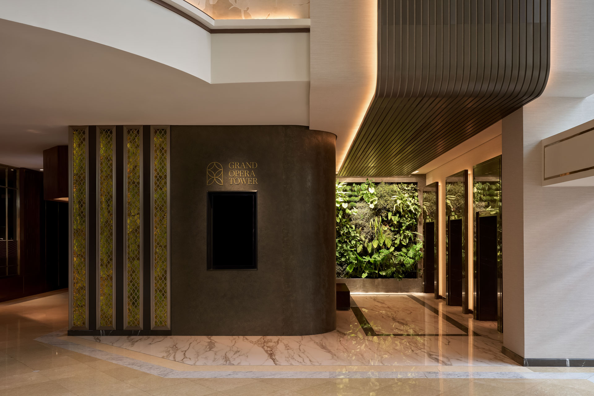 Tại sảnh tháp Grand Opera, ánh sáng ấm áp, chất liệu kim loại vàng đồng và khu vườn xanh mát tạo nên một ốc đảo tĩnh tại giữa lòng đô thị sôi động. Thiên nhiên hiện diện xuyên suốt không gian, từ mảng rêu xanh đến những phù điêu nhạc cụ dọc hành lang – sự giao hòa tinh tế giữa nghệ thuật điêu khắc hiện đại và di sản Nhà hát Thành phố.