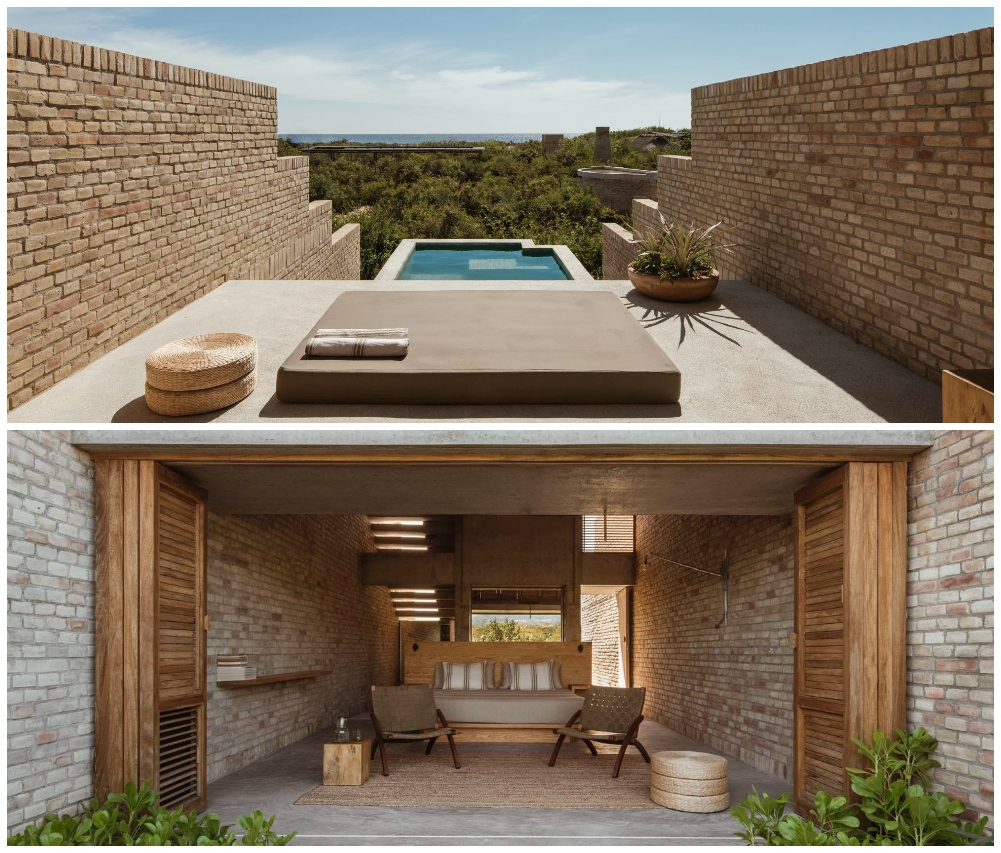 Ẩn mình trong một khu rừng nhiệt đới tươi mát, Hotel Terrestre gồm một chuỗi 7 toà nhà lấy cảm hứng từ chủ nghĩa táo bạo được thiết kế bởi kiến trúc sư Alberto Kalach và cộng sự tại Taller de Arquitectura X, đồng thời hợp tác với studio nội thất RB + K. Được chế tác bằng các vật liệu có nguồn gốc địa phương như gạch, gỗ, đất sét và cát, khu nghỉ dưỡng sở hữu hệ thống làm mát tự nhiên thay vì chỉ dựa vào điều hoà không khí. Để tăng thêm cảm giác sang trọng thời thượng cho cho các ngôi biệt thự được kết nối với nhau là đồ nội thất tuỳ chỉnh đến từ nhà thiết kế người Mexico Oscar Hagerman. Đặc biệt, những chiếc ghế Ruisenor mang nghĩa “chim nhại” trong tiếng Tây Ban Nha là điểm nội bật tại đây. Không gian khách sạn gần gũi với thiên nhiên, chủ yếu sử dụng vật liệu mang tính bền vững và hạn chế lắp nhiều kính.