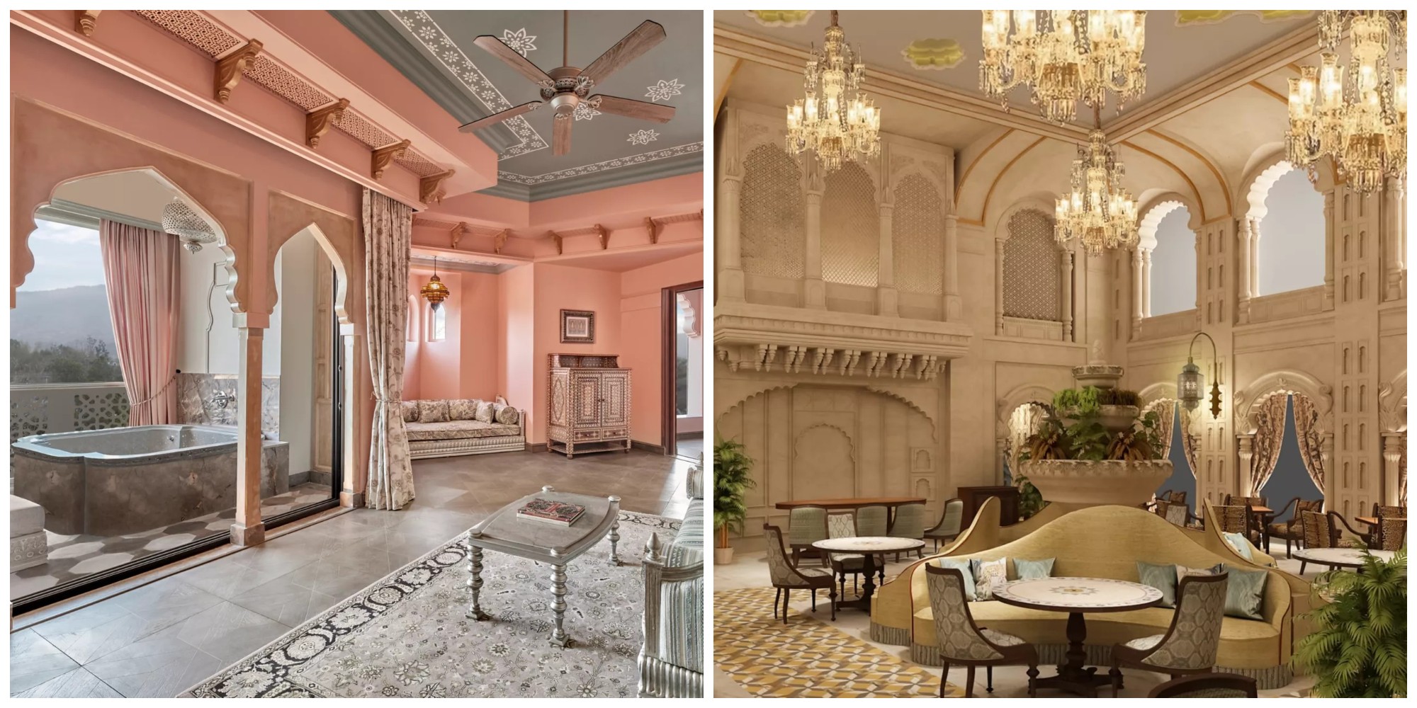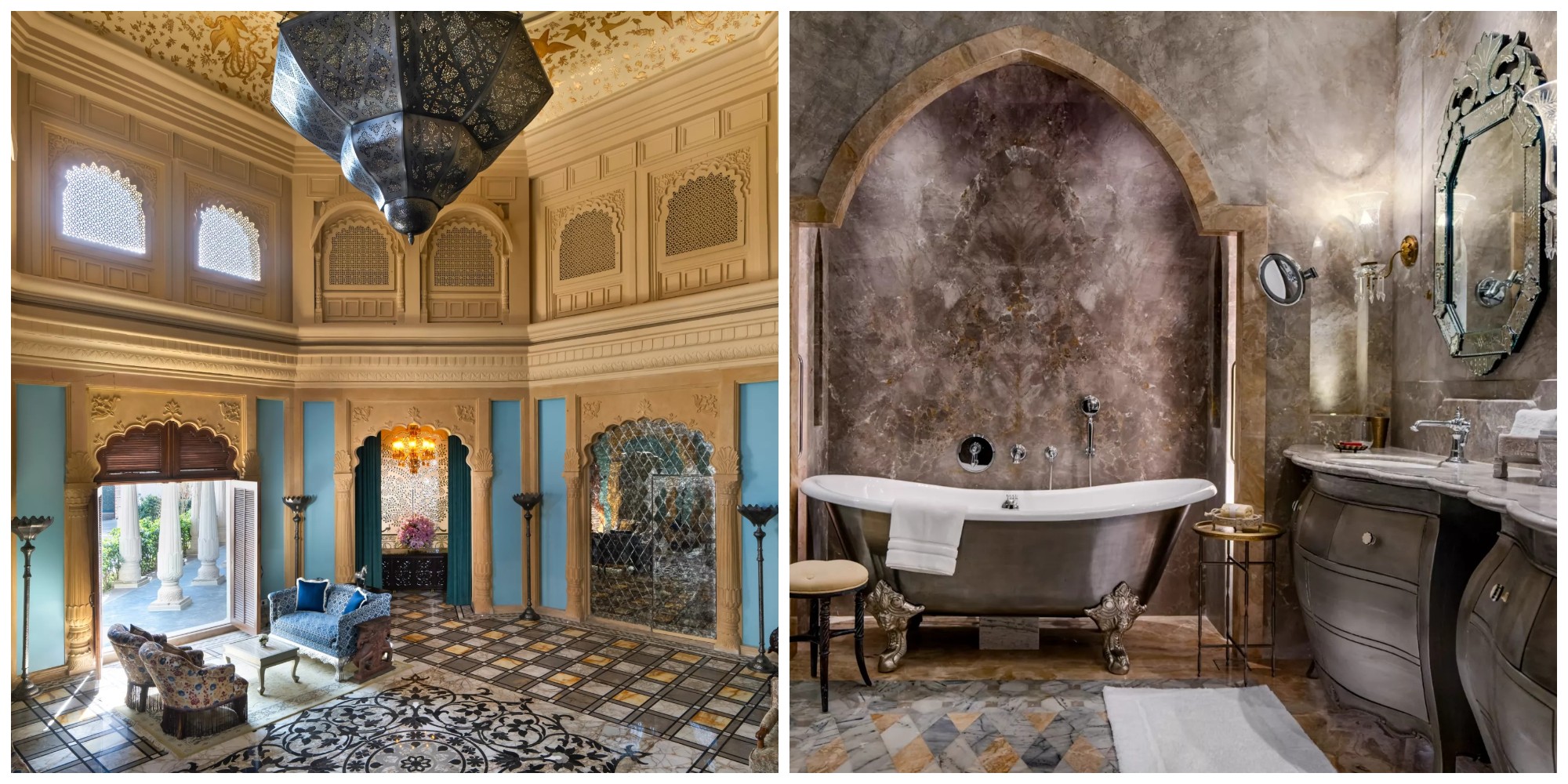 Mỗi yếu tố trong ‘cung điện xa hoa’ đều được các nghệ nhân lành nghề chế tác một cách tinh xảo, pha trộn giữa truyền thống cùng kỹ thuật lâu đời của kiến trúc Mughal và Rajputana. Tạo ra trải nghiệm vô cùng thân mật, 50 phòng và suite được bài trí, tô điểm độc đáo sở hữu ban công rộng rãi với bồn hoặc bể ngâm ngoài trời. Các chi tiết phức tạp tô điểm mọi góc nhỏ không gian, bao gồm trần sơn màu, tranh tường mạ vàng, đồ nội thất khảm xương lạc đà, đồ tạo tác có nguồn gốc địa phương và thảm dệt Jaipur.