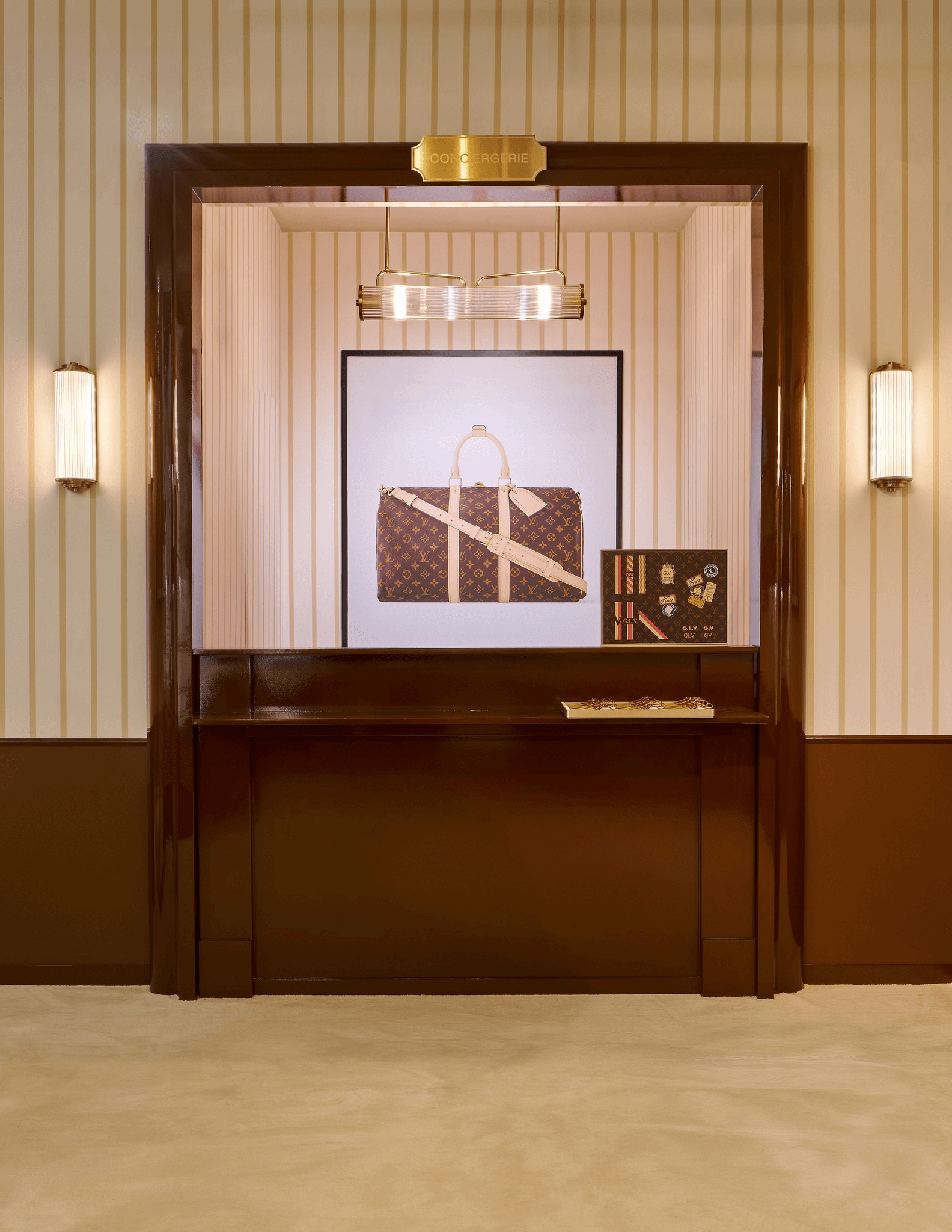 Điểm khởi đầu là Keepall Lobby, nơi giới thiệu lịch sử của họa tiết biểu tượng thông qua các tư liệu lưu trữ và hình ảnh từ kho di sản của Louis Vuitton. Không gian mang cảm giác như sảnh chào đón của một khách sạn, mở ra bối cảnh cho hành trình phía sau.