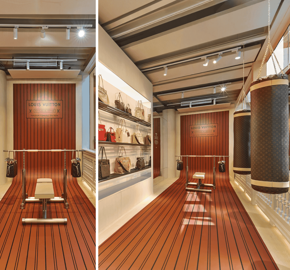 Từ đó, người tham quan bước vào Neverfull Gym, một không gian tràn đầy năng lượng lấy cảm hứng từ chiếc túi Neverfull nổi tiếng. Các sắp đặt thị giác mang tinh thần thể thao khiến họa tiết Monogram quen thuộc trở nên sinh động và mang hơi thở hiện đại.