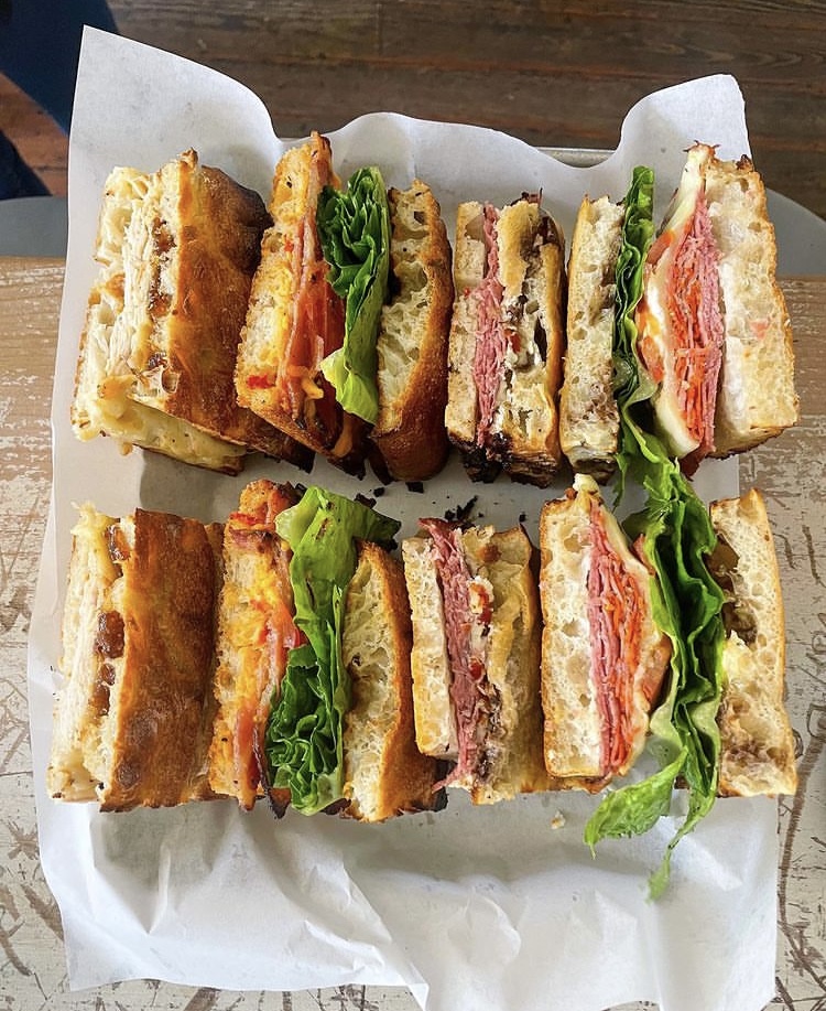 Bánh mì kẹp sandwich thịt nguội, phô mai, rau xanh.