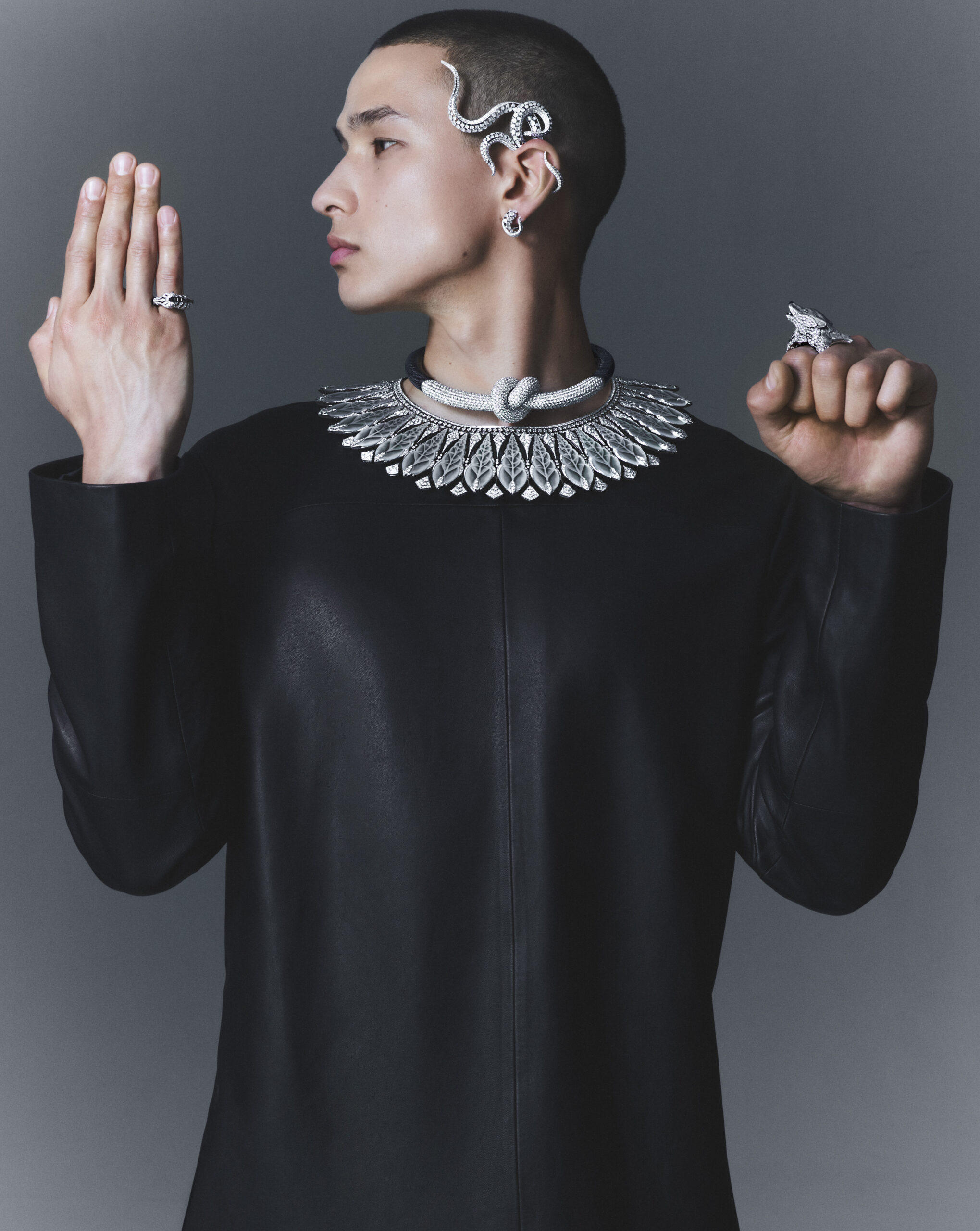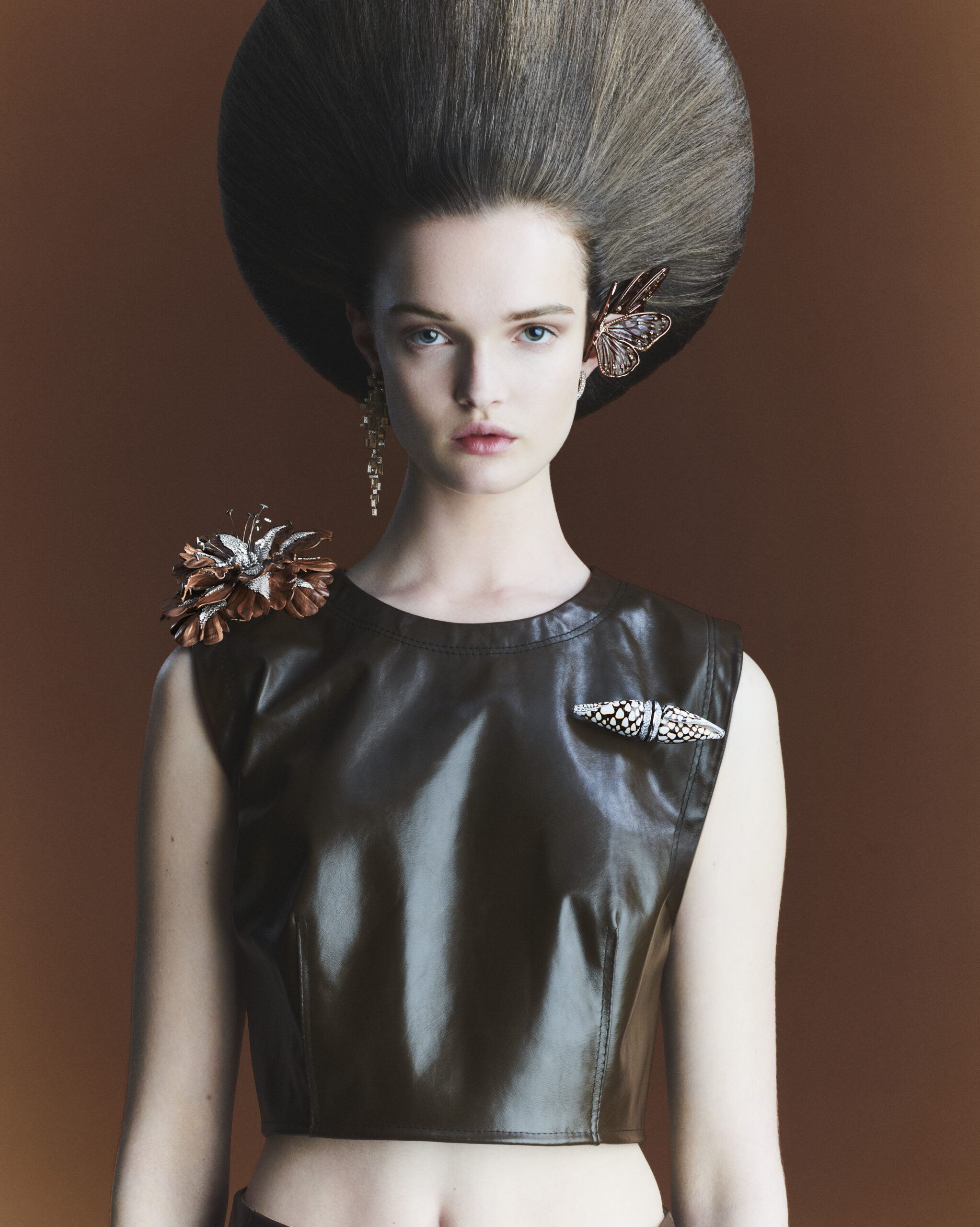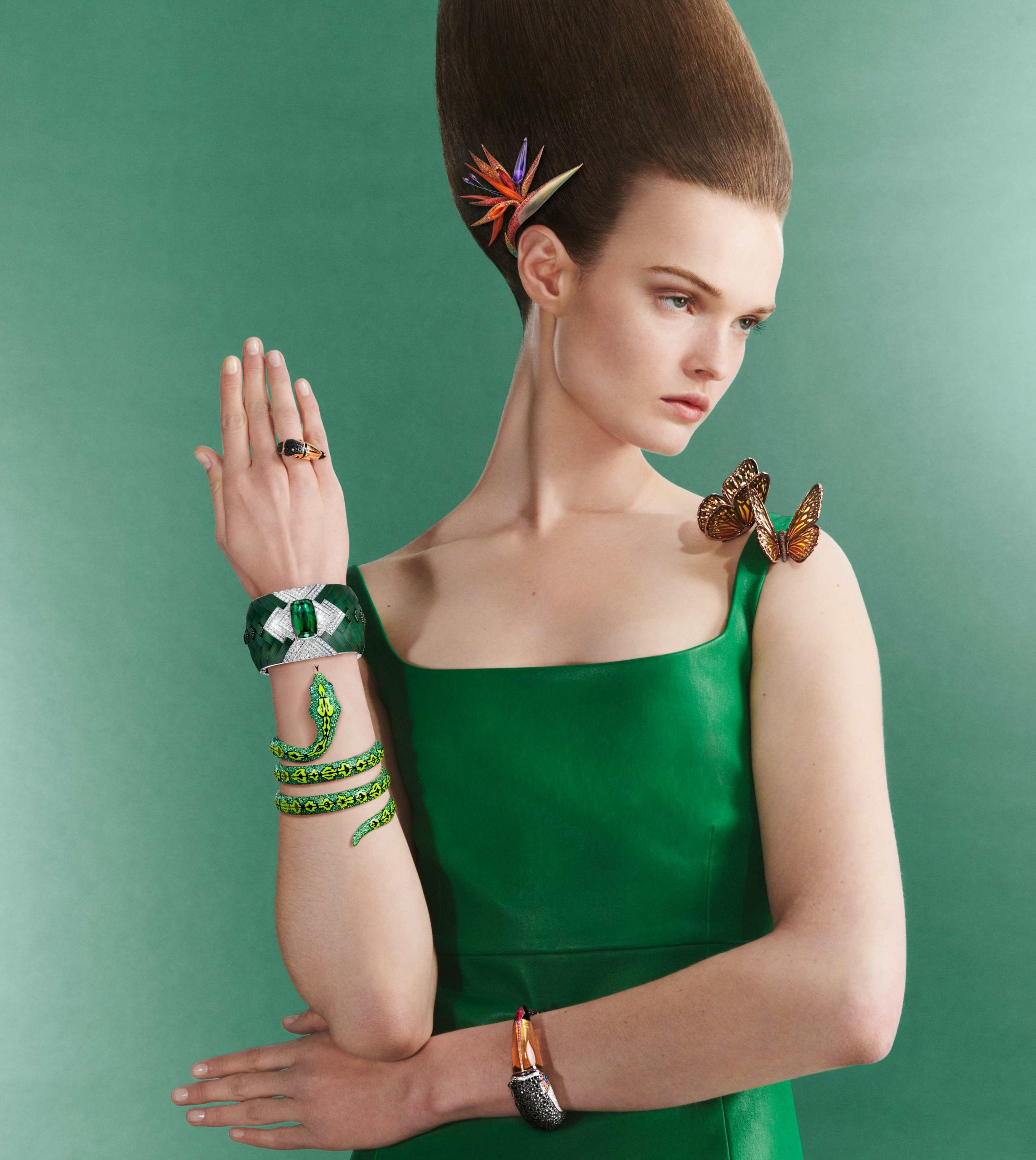 Dịu êm như khi đứng giữa một khu rừng nhiệt đới hoang sơ tươi tốt, mỗi một tác phẩm trong Leaf Woman mang theo nhip điệu rung động của thiên nhiên trong lành. Mô phỏng vẻ ngoài của những chiếc lá đan cài vào nhau, vòng tay Feuillage Diamant được tạo ra từ nhôm xử lý nhiệt điện xanh. Nổi bật trên tạo vật này, viên tourmaline 37,67 carat giữ vị trí trung tâm giữa kim cương trắng baguette và kim cương fancy. Những kỹ thuật chế tác đỉnh cao còn được áp dụng để tạo nên chiếc trâm cài tóc hình cánh bướm Lideopsis Vulgaris, đã được xử lý để giữ một thời gian dài trước khi “đóng khung” chúng vào một cấu trúc vững chắc, từ đó tái tạo hoàn tảo những đường cong ban đầu của tạo vật xinh đẹp này.