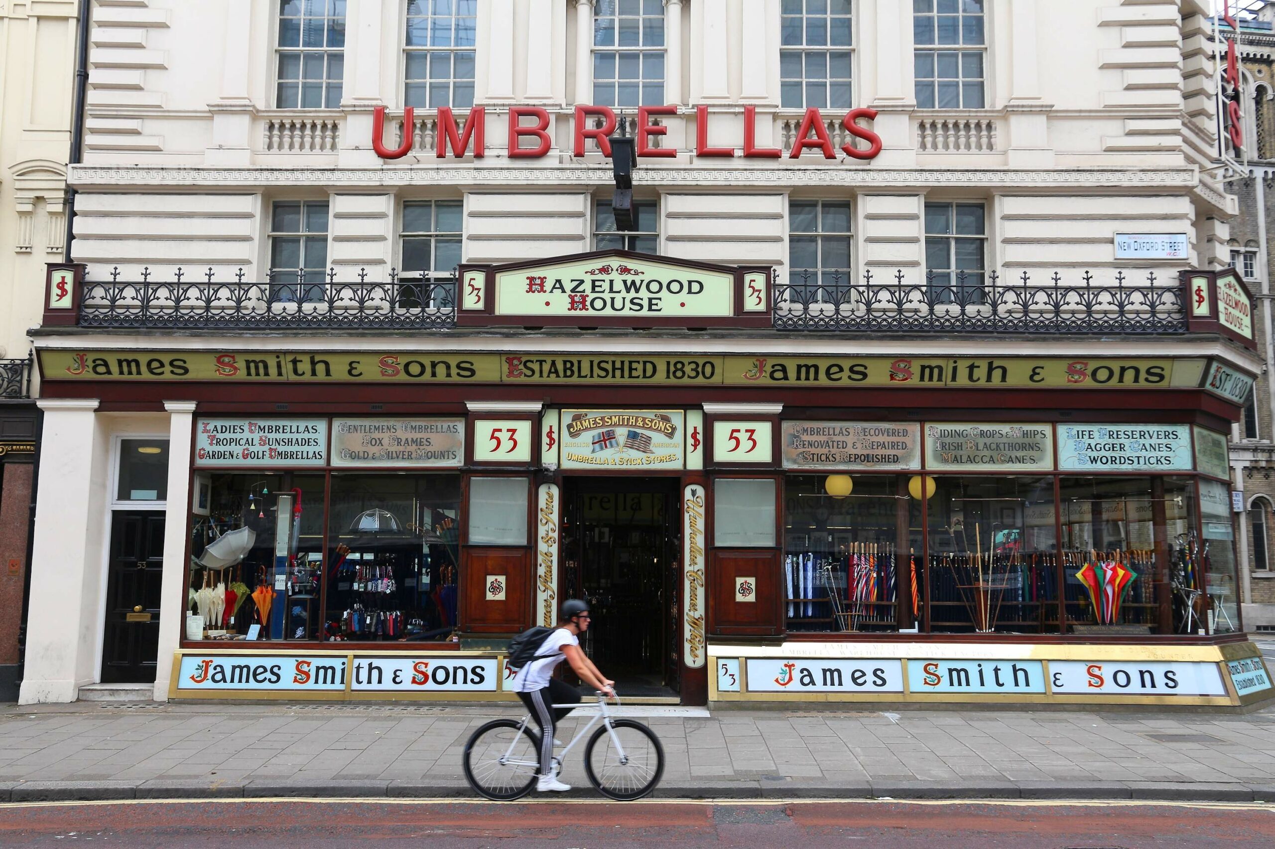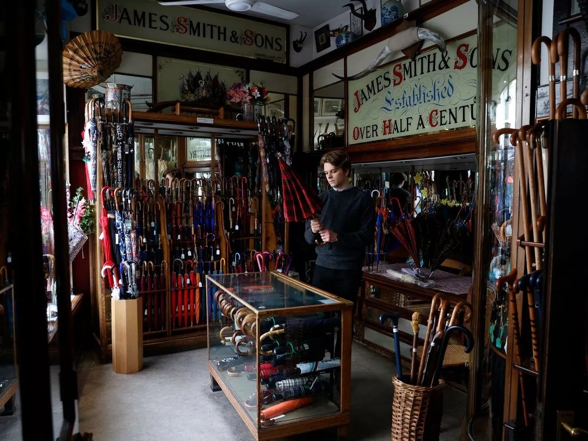 Các quý ông ở London đã tin tưởng giao phó việc chế tác ô cho James Smith & Sons trong hơn 185 năm. Cho dù kết hợp mũ quả dưa với ô Slim Rolled Umbrella, sử dụng mẫu ô Solid Stick Umbrella như một chiếc gậy hỗ trợ đi bộ, cửa hàng ô nhỏ ở góc phố New Oxford vẫn tấp nập người ra kẻ vào chỉ để tìm kiếm cho mình những chiếc ô chất lượng tốt nhất. Tọa lạc tại số 53 New Oxford Street, cách Bảo tàng Anh chỉ một quãng không dài, cửa hàng như cánh cửa dẫn ta trở về một thời đại đã qua hàng trăm năm; được bao bọc bởi những bức tường gỗ gụ chất đầy những cây gậy đi bộ, gậy gỗ, đầu nai, áp kế và đồng hồ. Trên quầy kính cũ kỹ, những cuốn sổ đặt hàng và sổ cái lót da nằm yên lặng lẽ với đầy những nét phác thảo nguệch ngoạc; minh chứng cho danh sách rất dài những khách hàng sành sỏi đã và đang chờ đợi để sở hữu một chiếc ô từ James Smith & Sons. Không chỉ dừng lại ở đó, một không gian khá lớn bên trong cửa hàng còn dành riêng cho những chiếc gậy đi bộ, gậy nông thôn và gậy yên xe dành cho những ai có đầu gối yếu.