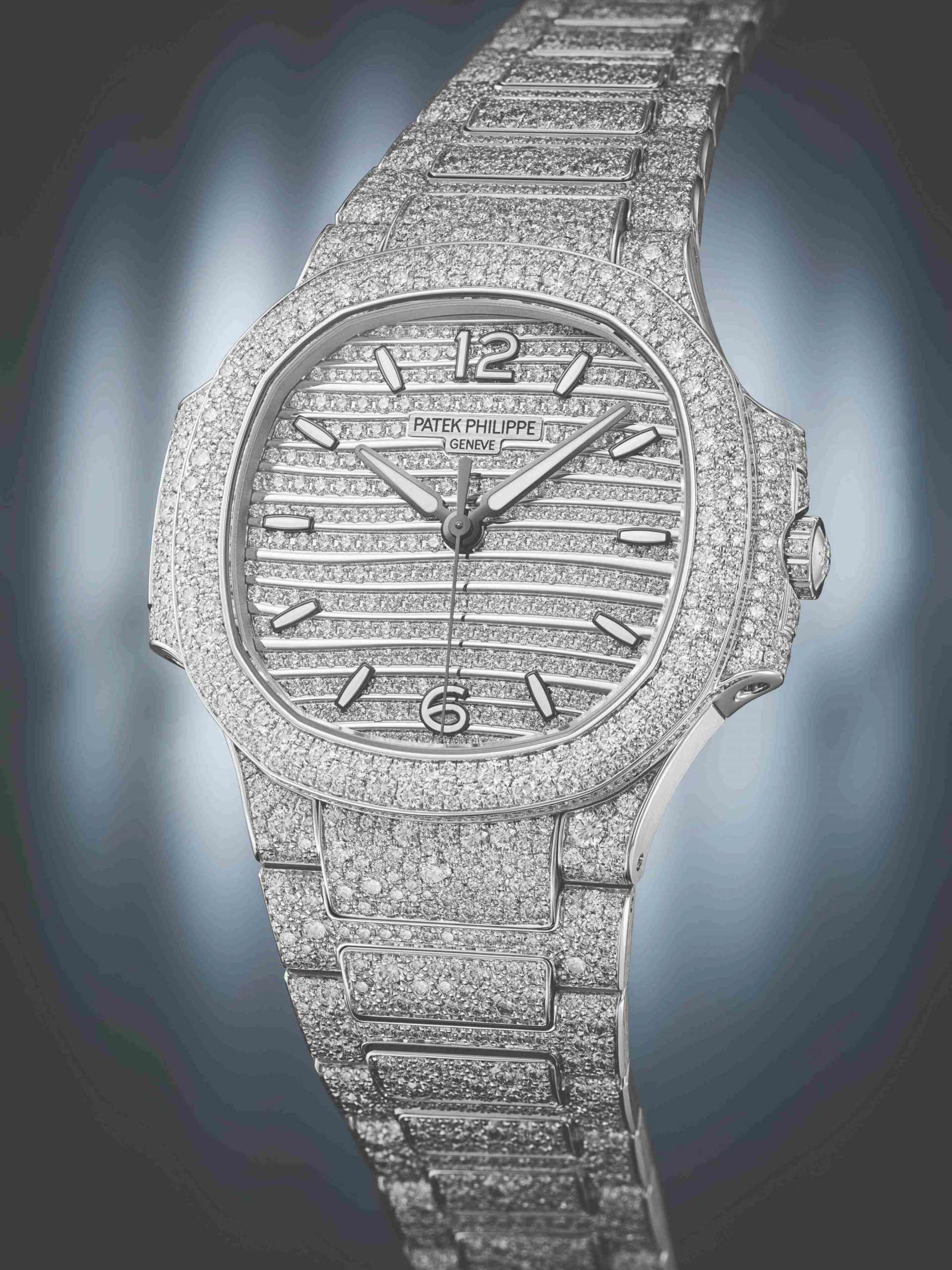 Bộ sưu tập cũng bao gồm những tuyệt tác nạm đá quý tuyệt đẹp, trong số đó có Ref. 7118 / 1450G Nautilus Haute Joaillerie. Được đặt trong một chiếc vỏ hoàn toàn bằng vàng trắng 18K kết nối với vòng tay tương tự, hơn 2.500 viên kim cương trắng rực rỡ đã hoàn thiện vẻ đẹp lộng lẫy của mẫu đồng hồ ngoại hạng này. Kim cương được nạm tuyết trên gờ, vỏ và vòng đeo tay khiến cho vẻ quyến rũ rạng ngời của chúng hòa quyện với nhau thành một dải ánh sáng lộng lẫy.