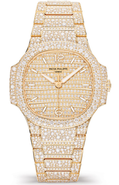 Mặc dù việc thực hiện nghệ thuật nạm đá thủ công là một kỳ công không hề dễ dàng, mọi dường như thách thức còn được phóng đại lên nhiều lần trên những cỗ đồng hồ phức tạp. Patek Philippe lần đầu tiên thực hiện điều này trên chiếc Ref. 7118 / 1450R- 001 bằng vàng hồng, khi họ giới thiệu sự mở rộng của gia đình Nautilus tại sự kiện Watches & Wonders 2022 vào năm 2021. Trên phiên bản vàng trắng ấy, vàng đen được áp dụng các mốc giờ và kim đồng hồ phù hợp tạo sự tương phản so với mặt số trắng sáng. 286 viên kim cương được nạm theo hình gợn sóng tinh tế, tạo nên sự đồng nhất với chi tiết kim phút. Đây tự hào là một chiếc đồng hồ được trang hoàng mà khó có thương hiệu nào có thể mô phỏng lại được. Nhà sản xuất Thụy Sỹ đã chứng minh rằng tác phẩm của mình chứa đựng nhiều kỹ năng được trau dồi kỹ lưỡng qua nhiều khía cạnh, đồng thời tính thẩm mỹ cũng đặt đến một đẳng cấp rất cao