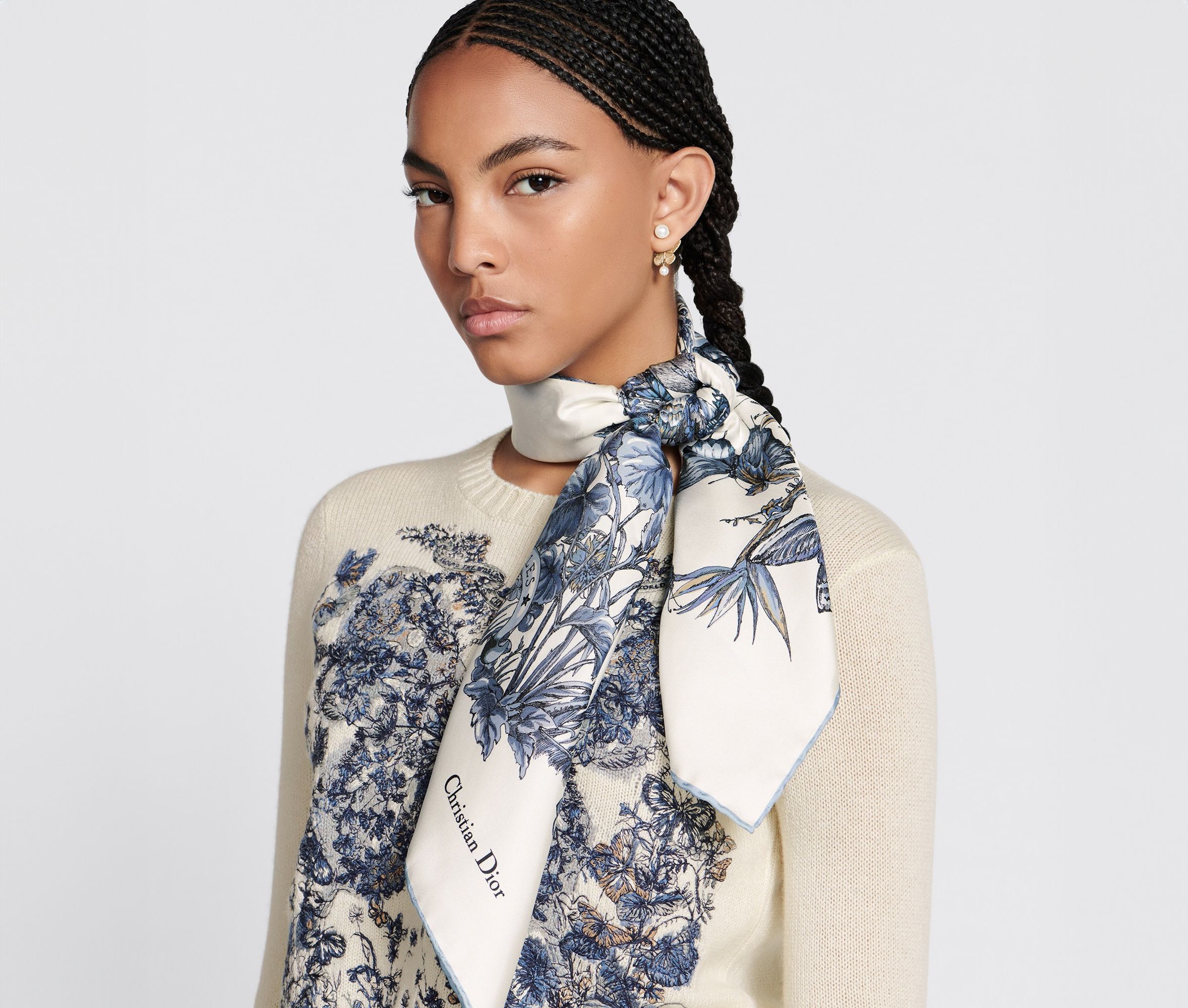 Hướng đến mục tiêu mang đến ngoại diện mới cho quý cô, Dior đã tập trung phát triển mảng phụ kiện khăn choàng ngay từ buổi đầu thành lập. Phụ kiện đa năng kết hợp các họa tiết và thiết kế biểu tượng nhất của thương hiệu nước Pháp, bao gồm cả ‘oblique’. Mỗi chiếc khăn lụa vuông Dior đều kèm theo khăn ‘mitzah’ phù hợp có thể buộc vào túi xách, đeo như chiếc vòng tay hoặc dây buộc tóc để tạo nên tổng thể ngoại diện hài hòa. Bên cạnh khăn gia công từ lụa, Dior còn nuông chiều đa dạng sở thích khách hàng với nhiều loại khăn len lông cừu thông dụng hàng ngày. Bên cạnh đó, một trong những chiếc khăn Dior bán chạy nhất là Dior ‘Oblique’ dệt từ vải cashmere đồng thời mang họa tiết jacquard đặc trưng. Được sản xuất tại Ý, khăn Dior có giá từ 250 USD cho khăn mitzah đến 960 USD cho tùy chọn khăn vuông 140cm 100% lụa lóng chéo.